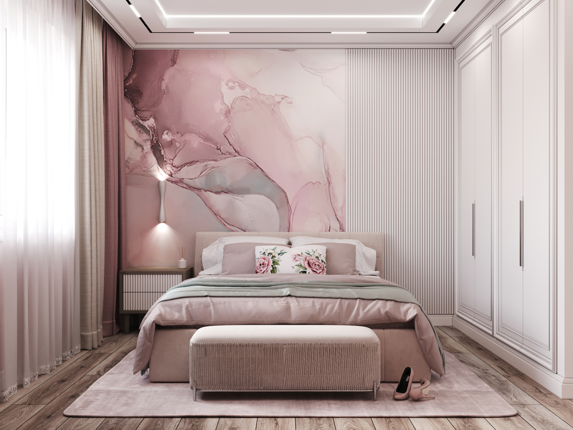 Эта квартира сделана для мамы одного из заказчиков, с которым мы работали уже не первый год. Мы тщательно проработали планировочное решение, учитывая все пожелания, выбрали наиболее подходящий вариант расположения мебели и сантехнического оборудования (при этом была выполнена перепланировка квартиры). В ходе обсуждения оказалось, что заказчице, как истиной девушке, нравятся нежные розовые оттенки, важны мягкость, легкость и спокойствие. Поэтому квартира получилась очень воздушной, с элементами классического стиля. Однако, одну комнату мы сделали "мужской", в активной синей гамме. Дело в том, что у заказчицы 3 внука, которые часто приходят в гости, и чтобы мальчишкам было комфортно, цветовое сочетание по этой комнате сделали контрастным ко всей остальной квартире.