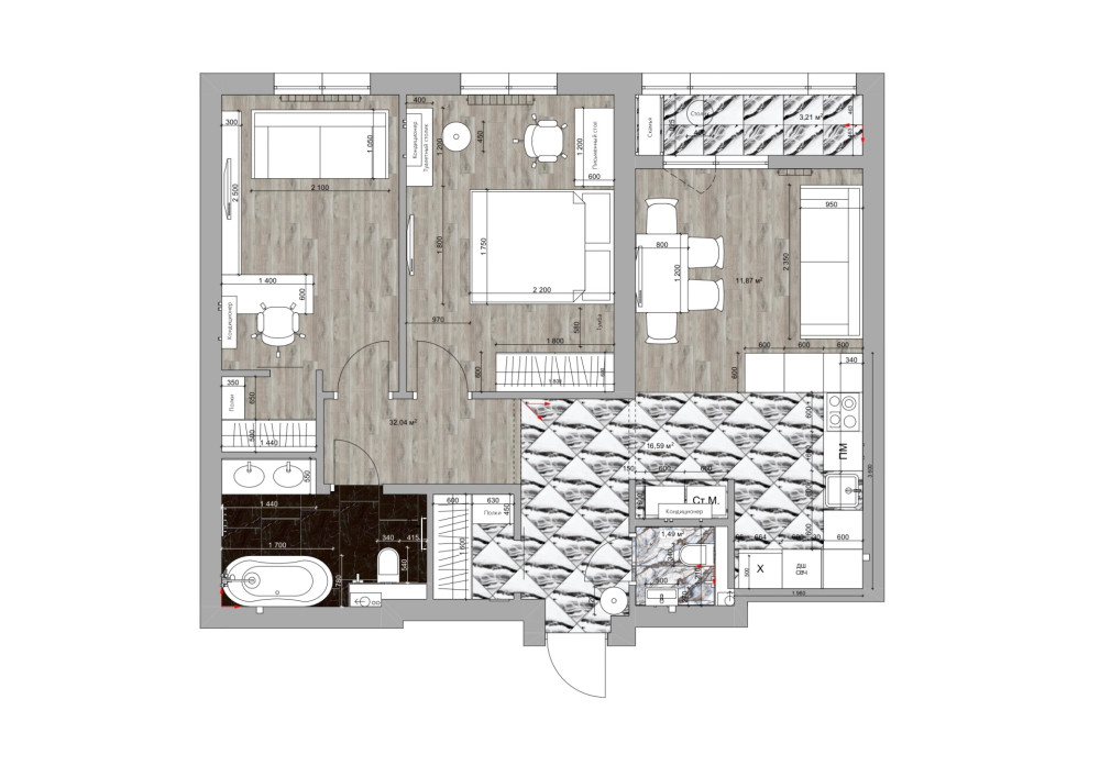 Проект квартиры разрабатывался для мамы с дочкой. На первой встрече, обсуждая стилистику и цветовую гамму, заказчица сказала, что им нужно что-то спокойное, нейтральное, бежевое. Далее нам предстоял поход по магазинам. Перед тем, как приступить к работе над визуализацией, мы с заказчиками обязательно смотрим реальные отделочные материалы, чтобы была возможность сориентироваться, прицениться, потрогать. В такой поход мы не ищем что-то определенное, я просто показываю разные материалы, рассказываю о них, объясняю плюсы и минусы того или иного покрытия. И советую заказчику не зацикливаться и не представлять, впишется это или не впишется в интерьер (предоставить это мне), а просто расслабиться и говорить, что нравится, а что нет. В магазине, при просмотре керамогранита выбор заказчицы пал на очень "смелую" плитку с ярким акцентным черным узором. Я не стала напоминать про пожелание бежевого нейтрального интерьера, а решила посмотреть, что будет выбрано еще. Так выяснилось, что заказчице на самом деле нравятся очень смелые цветовые решения, но страшно от того, что нет представления, как это можно сочетать между собой. Таким образом у нас появился эффектный акцентный пол, который встречает гостей в прихожей, смелые геометричные 3д-обои с декоративной стеной в зоне ТВ, интересные объемные панели с подсветкой на лоджии и яркие обои в спальне хозяйки.