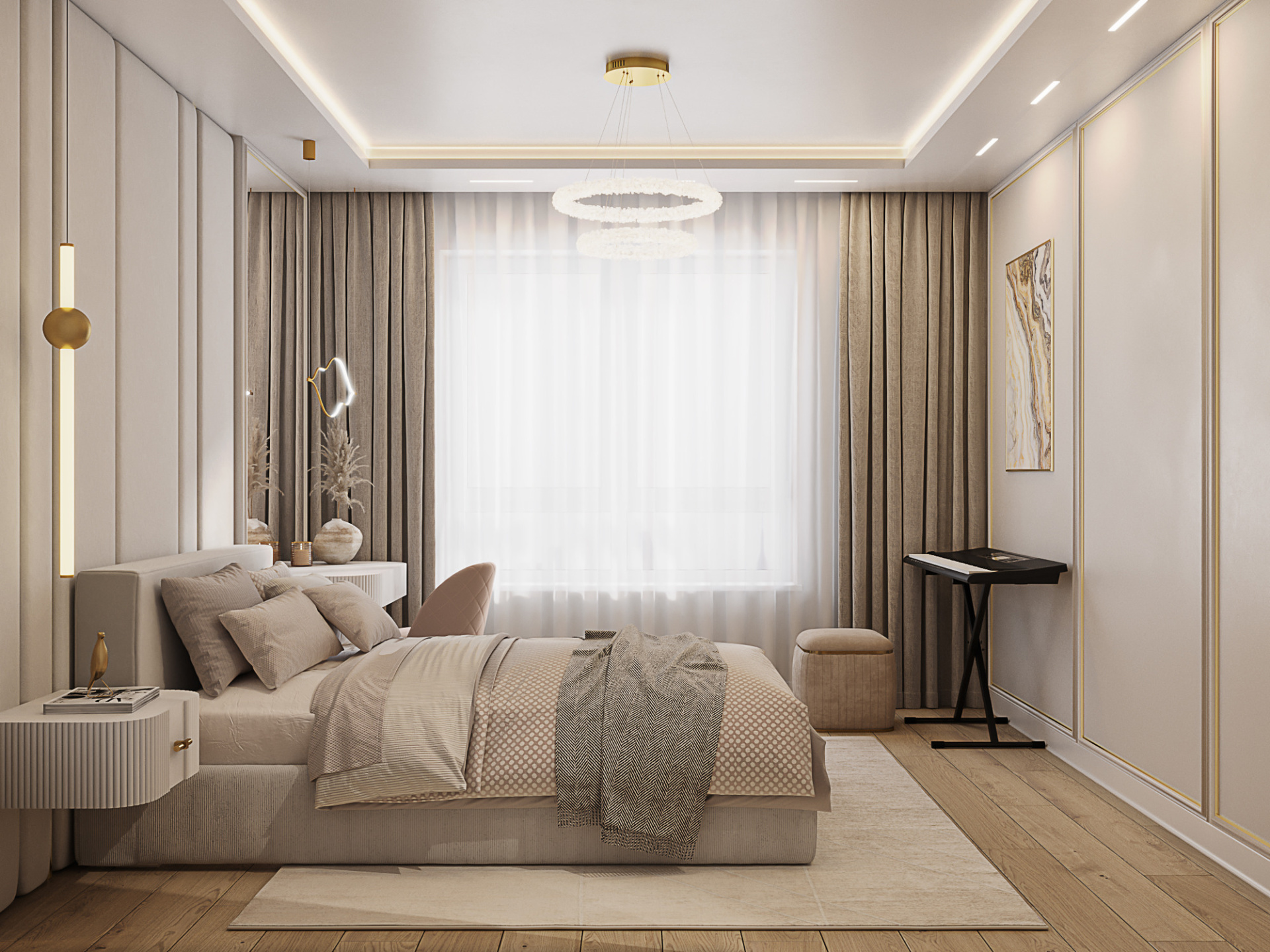 На данном объекте была выполнена перепланировка: мы присоединили гостиную к кухне, а также присоединили лоджию, в результате чего у нас получилось объемное пространство, полное света и воздуха! В ходе обсуждения цветовой гаммы, пришли к решению, что квартира должна быть максимально в спокойный, нейтральных оттенках. Однако, это не распространялось на санузлы, поэтому они были выполнены с применением достаточно яркой плитки. Дочке очень нравилась фурнитура в цвете золота, а также она хотела видеть оформление стен с использованием молдингов, поэтому ее комната отличается стилистически от остальной квартиры. Кроме того, в ходе реализации проекта, заказчики решили заменить фурнитуру во всей квартире на латунь.