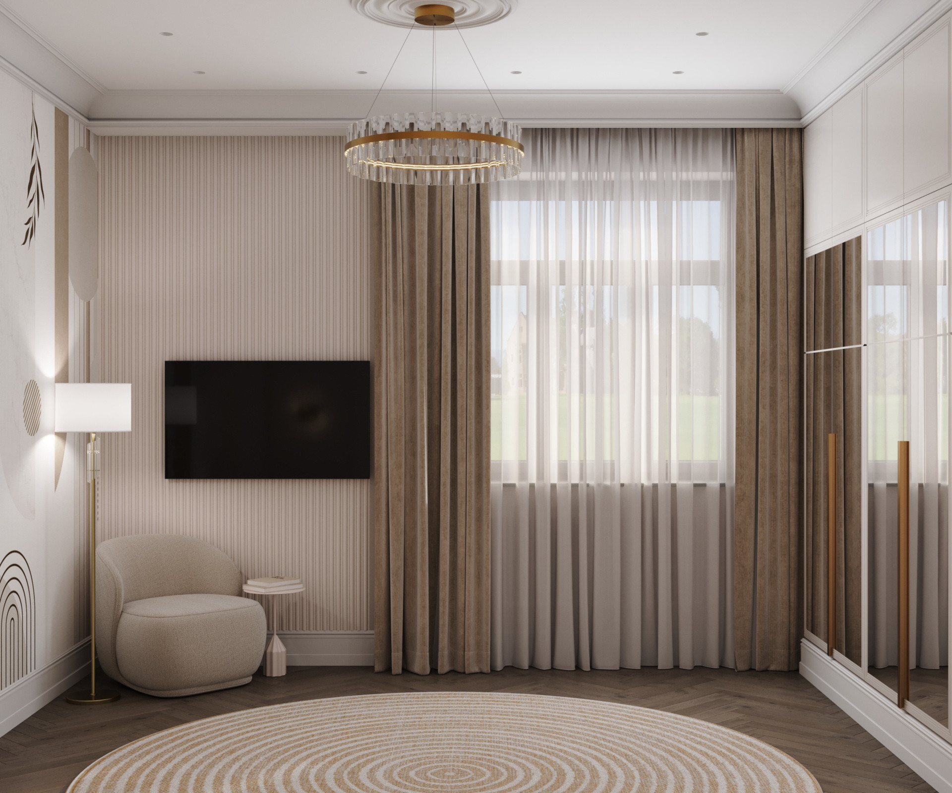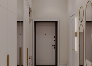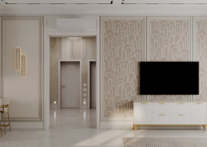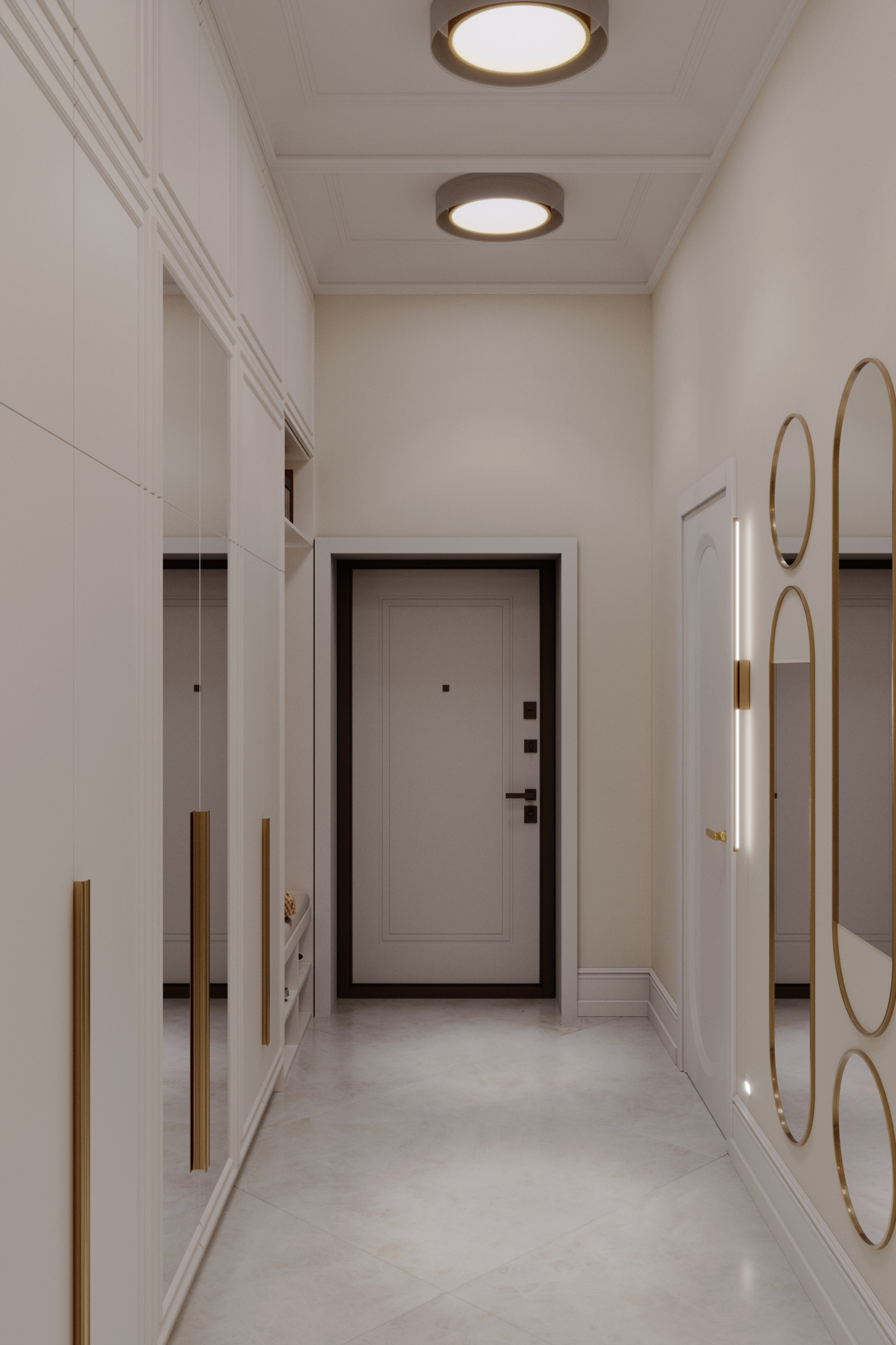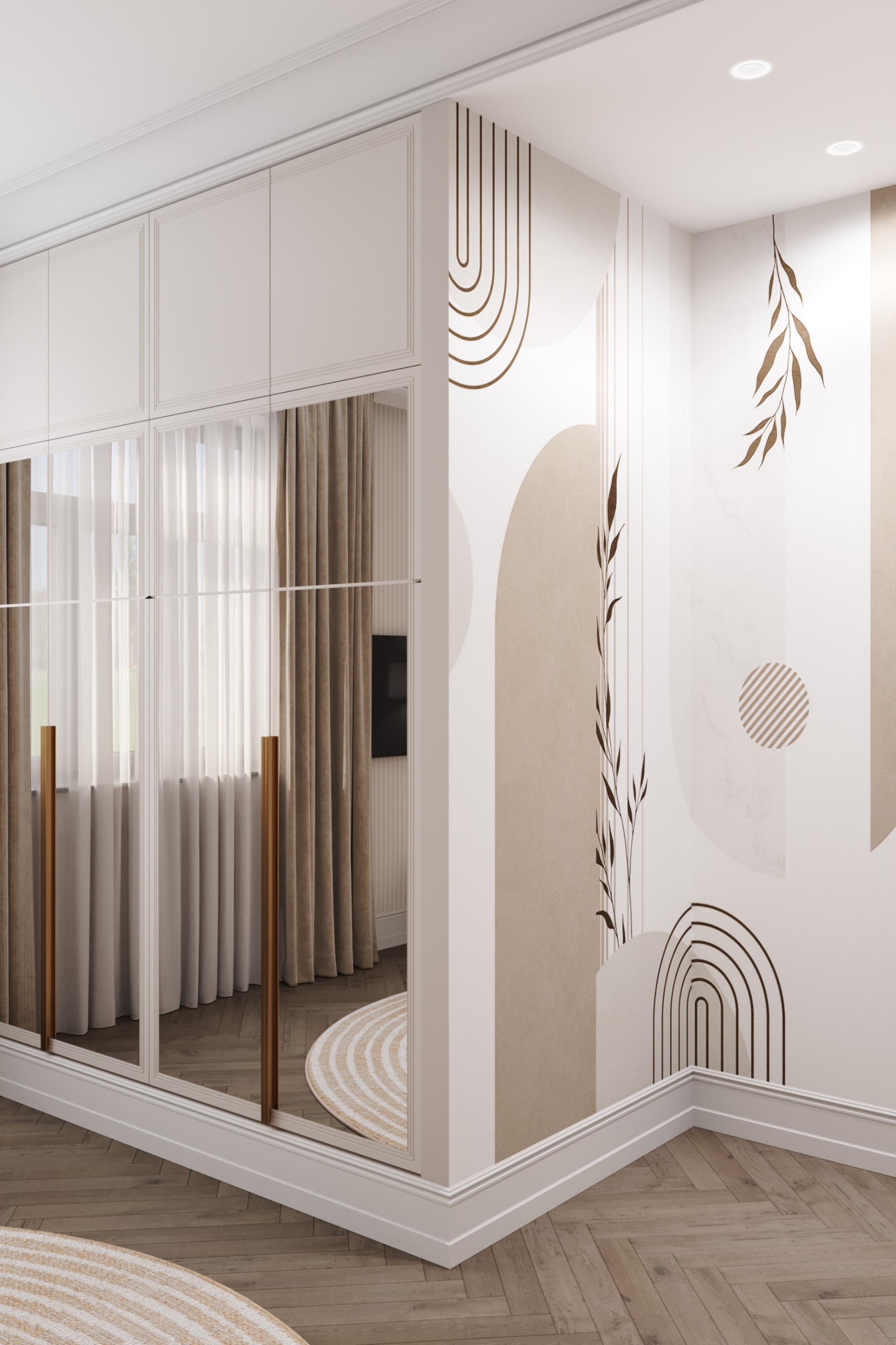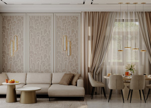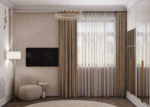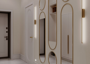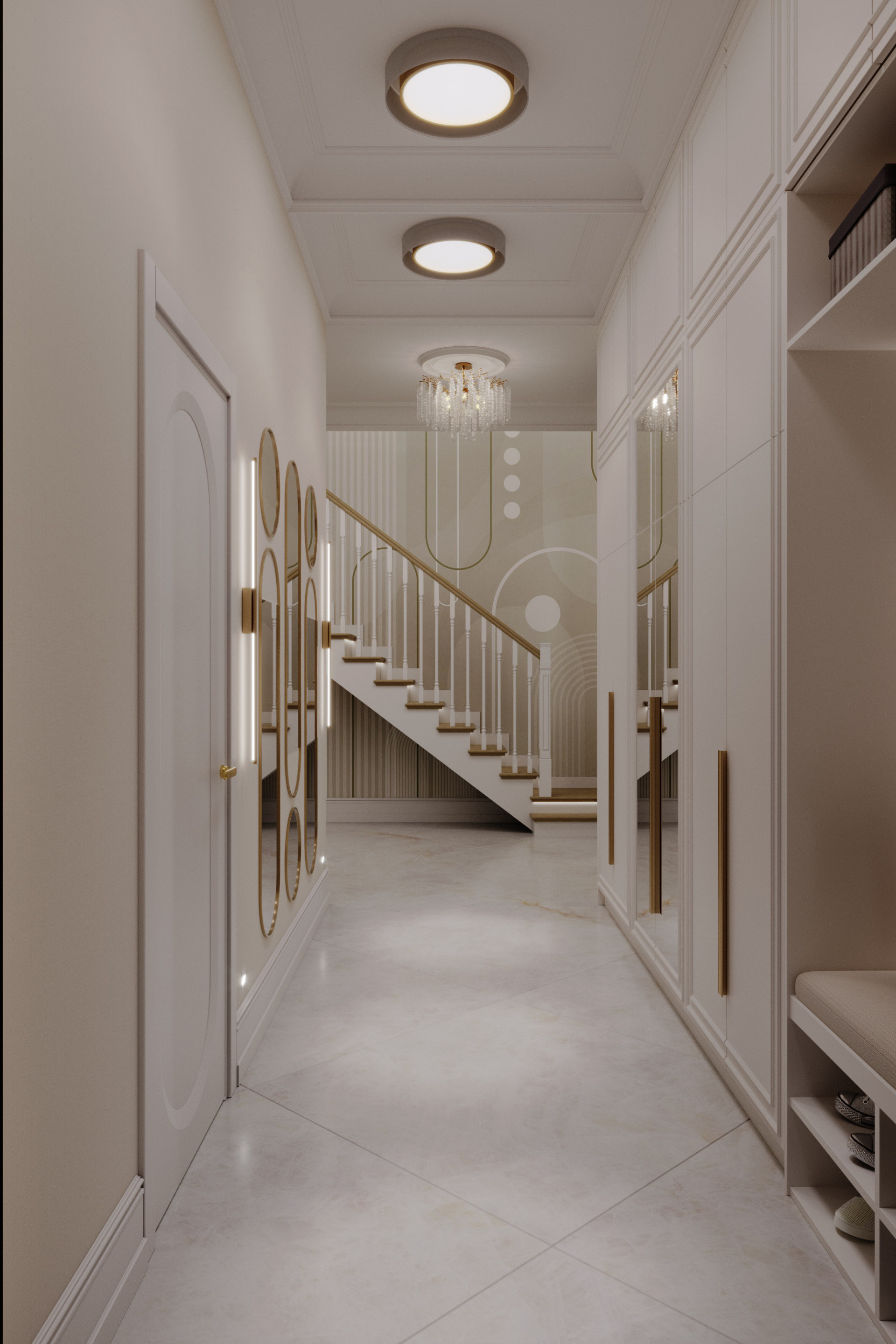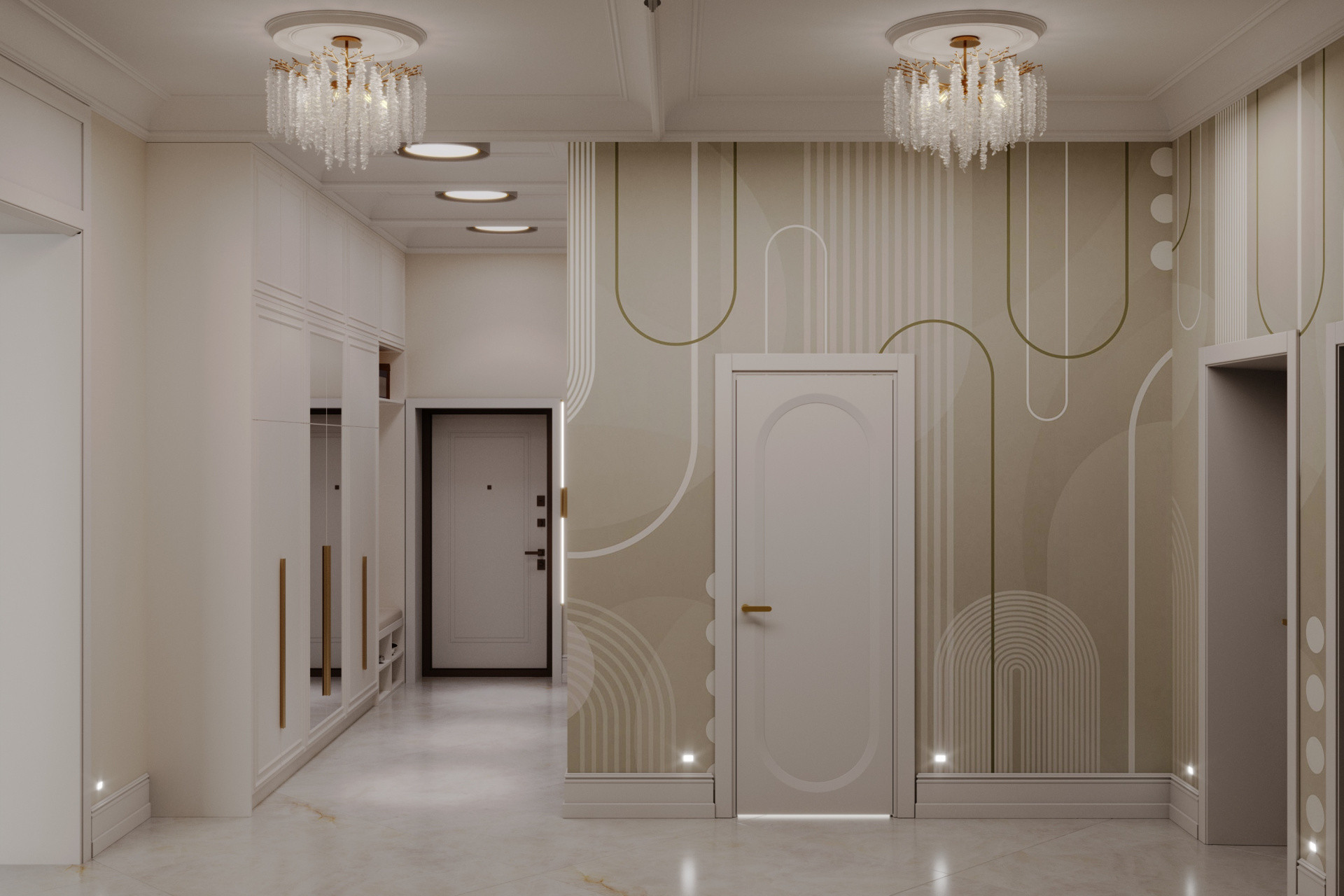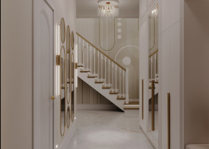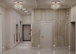 Этот проект мы разработали для нашего постоянного Заказчика. В пожеланиях было создать достаточно минималистичный интерьер для молодой девушки - дочери Заказчика. В ходе проектирования мы меняли общую цветовую гамму интерьера, стилистику и орнамент обоев, подбирая оптимально подходящий вариант, т.к. у хозяйки дома изначально не было четкого понимания в каких тонах хотелось бы видеть свой интерьер. Обычно такое понимание приходит во время совместного выезда на предварительный подбор материалов, который мы осуществляем еще до начала работы над Дизайн-проектом. Но в данном случае провести такой выезд у нас не было возможности и всё подбиралось уже в процессе проектирования. В ходе обсуждений была согласована светлая нейтральная цветовая гамма с добавлением кремово-кофейного оттенка в текстителе и обоях. Геометрический орнамент сделал интерьер более молодежным и современным, а молдинги, добавленные к его плавным линиям, придали интерьеру классики.