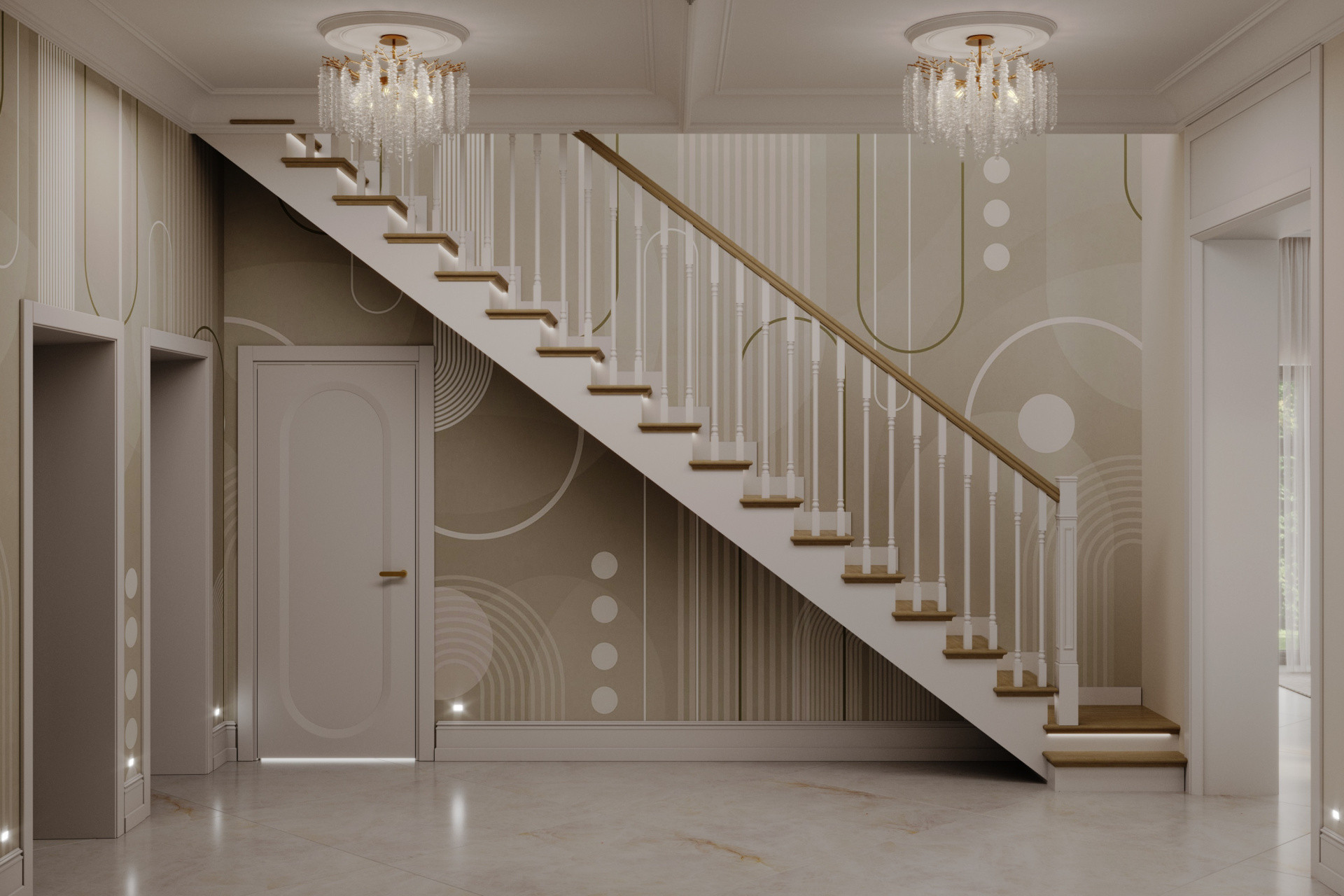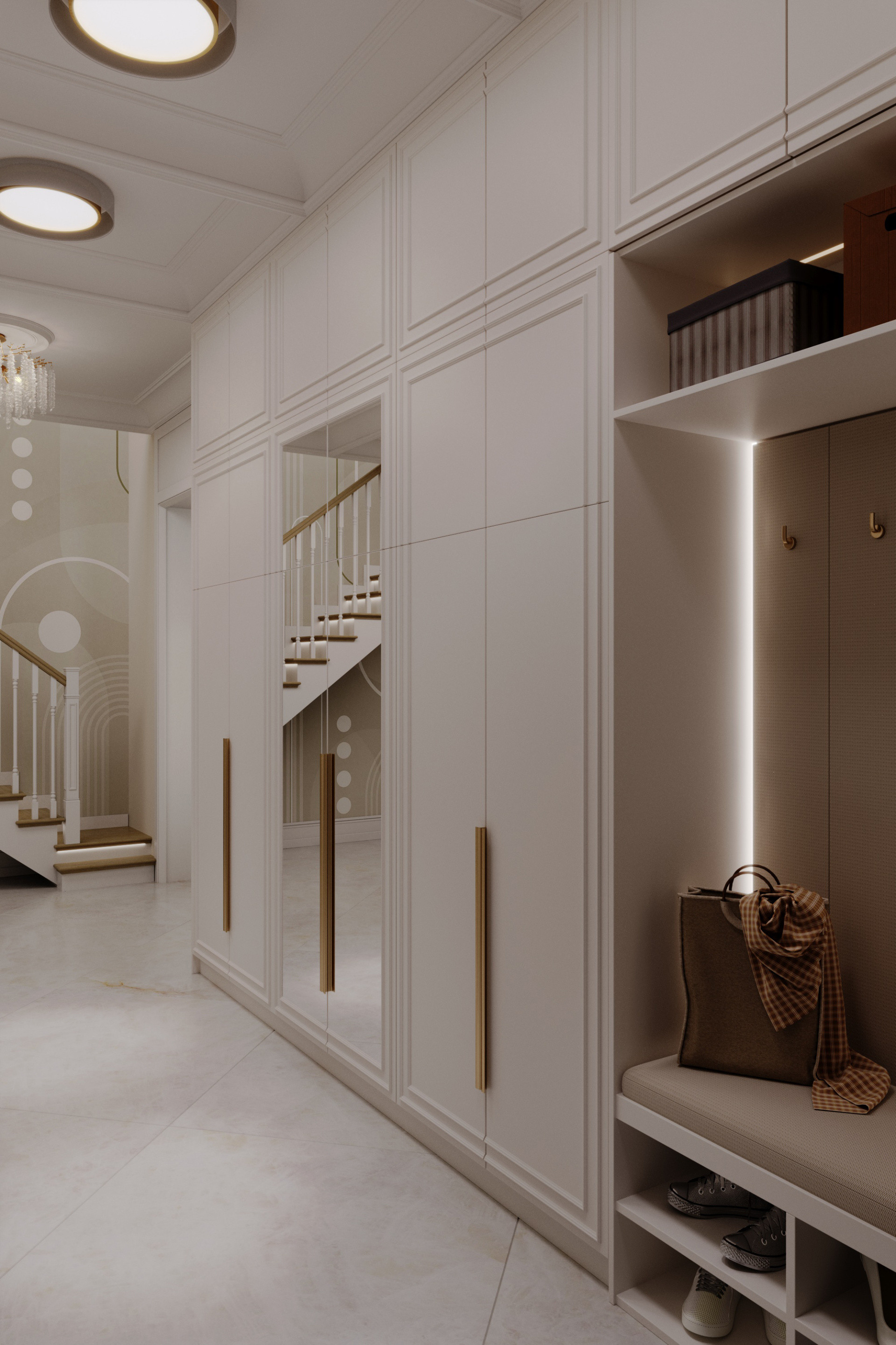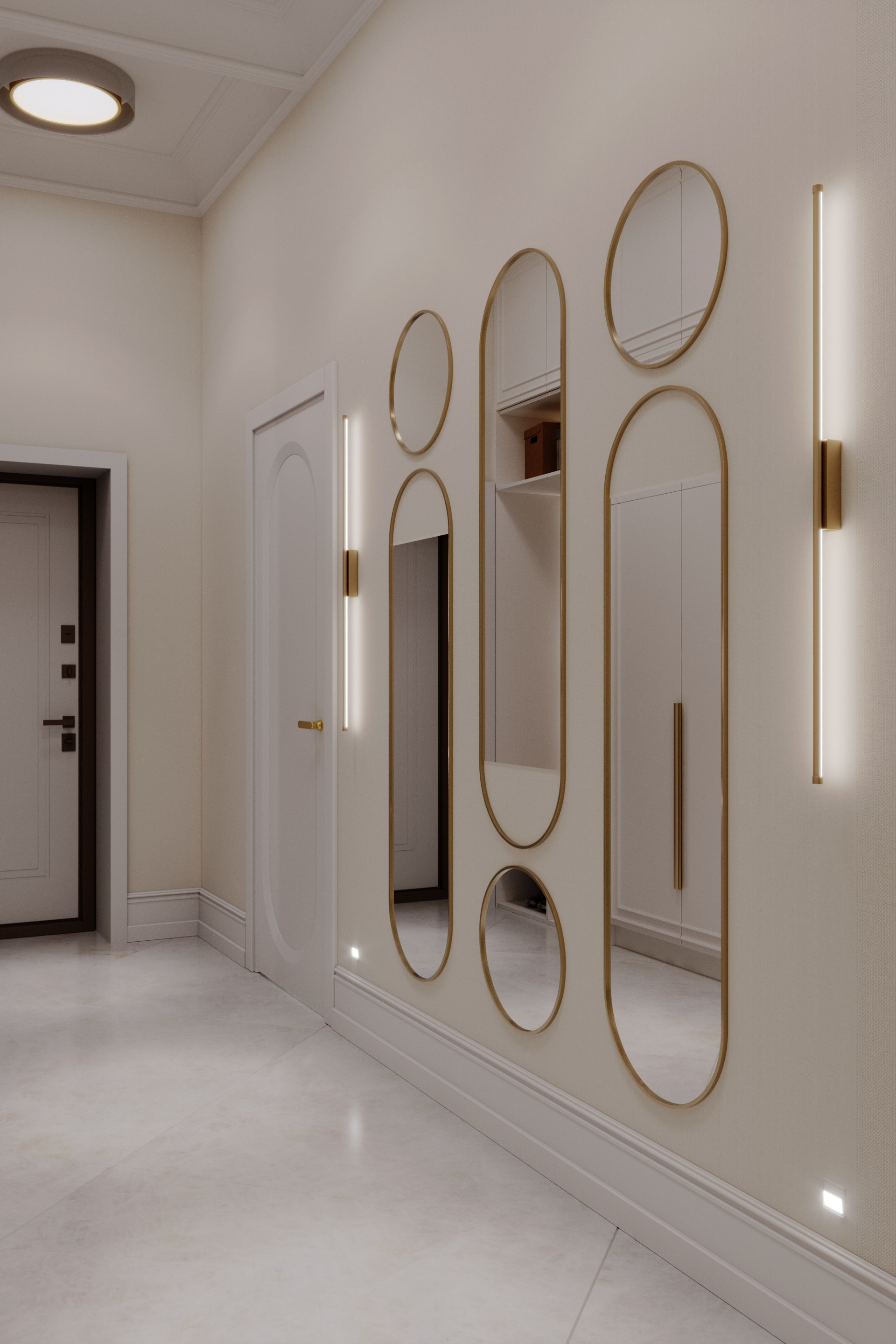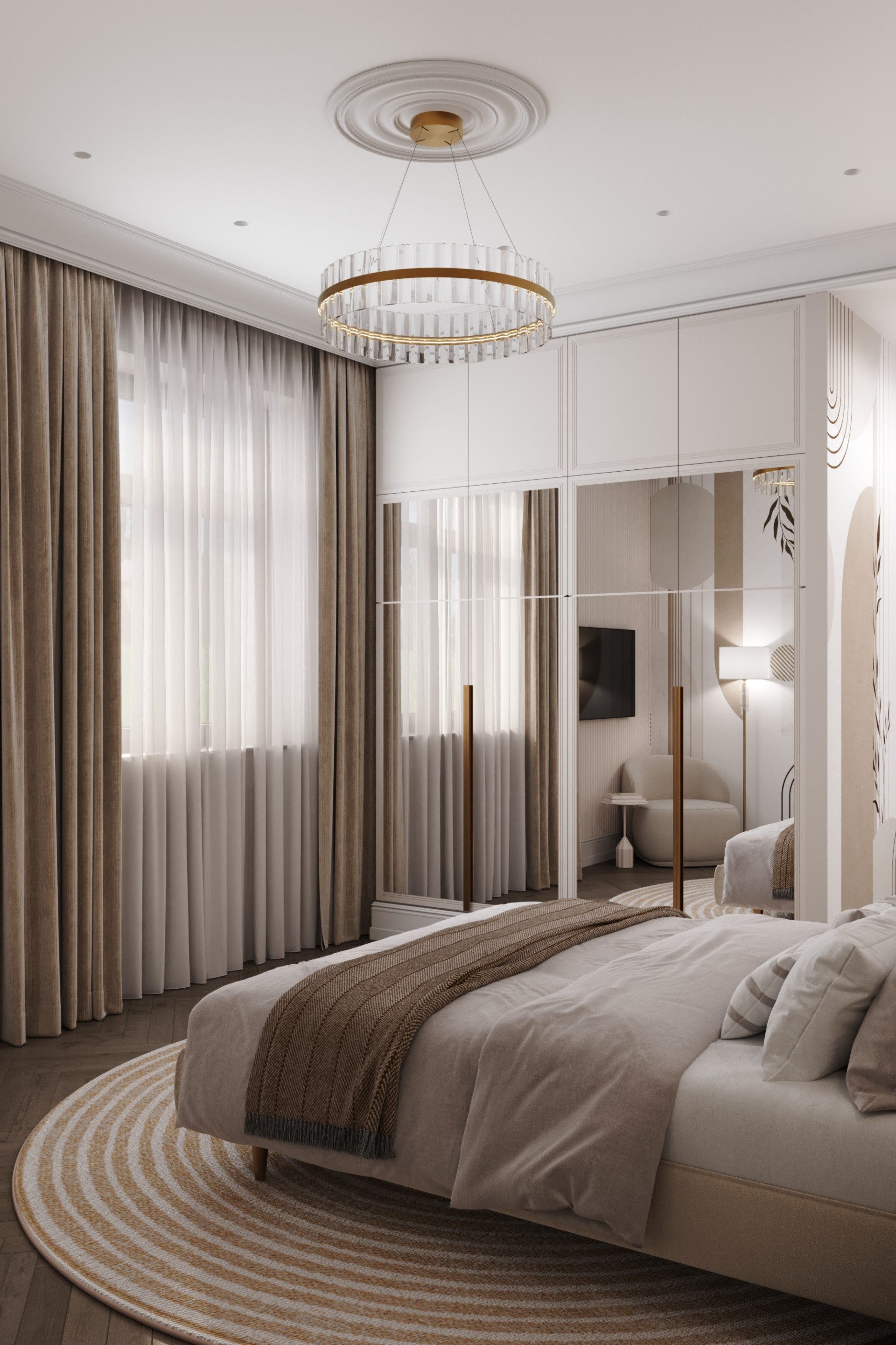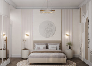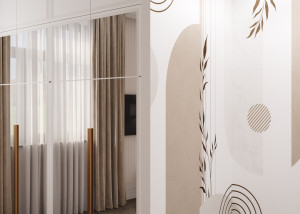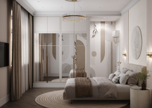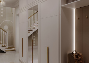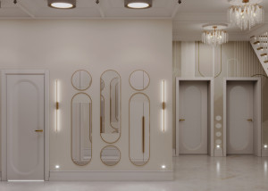 Этот проект мы разработали для нашего постоянного Заказчика. В пожеланиях было создать достаточно минималистичный интерьер для молодой девушки - дочери Заказчика. В ходе проектирования мы меняли общую цветовую гамму интерьера, стилистику и орнамент обоев, подбирая оптимально подходящий вариант, т.к. у хозяйки дома изначально не было четкого понимания в каких тонах хотелось бы видеть свой интерьер. Обычно такое понимание приходит во время совместного выезда на предварительный подбор материалов, который мы осуществляем еще до начала работы над Дизайн-проектом. Но в данном случае провести такой выезд у нас не было возможности и всё подбиралось уже в процессе проектирования. В ходе обсуждений была согласована светлая нейтральная цветовая гамма с добавлением кремово-кофейного оттенка в текстителе и обоях. Геометрический орнамент сделал интерьер более молодежным и современным, а молдинги, добавленные к его плавным линиям, придали интерьеру классики.