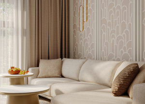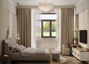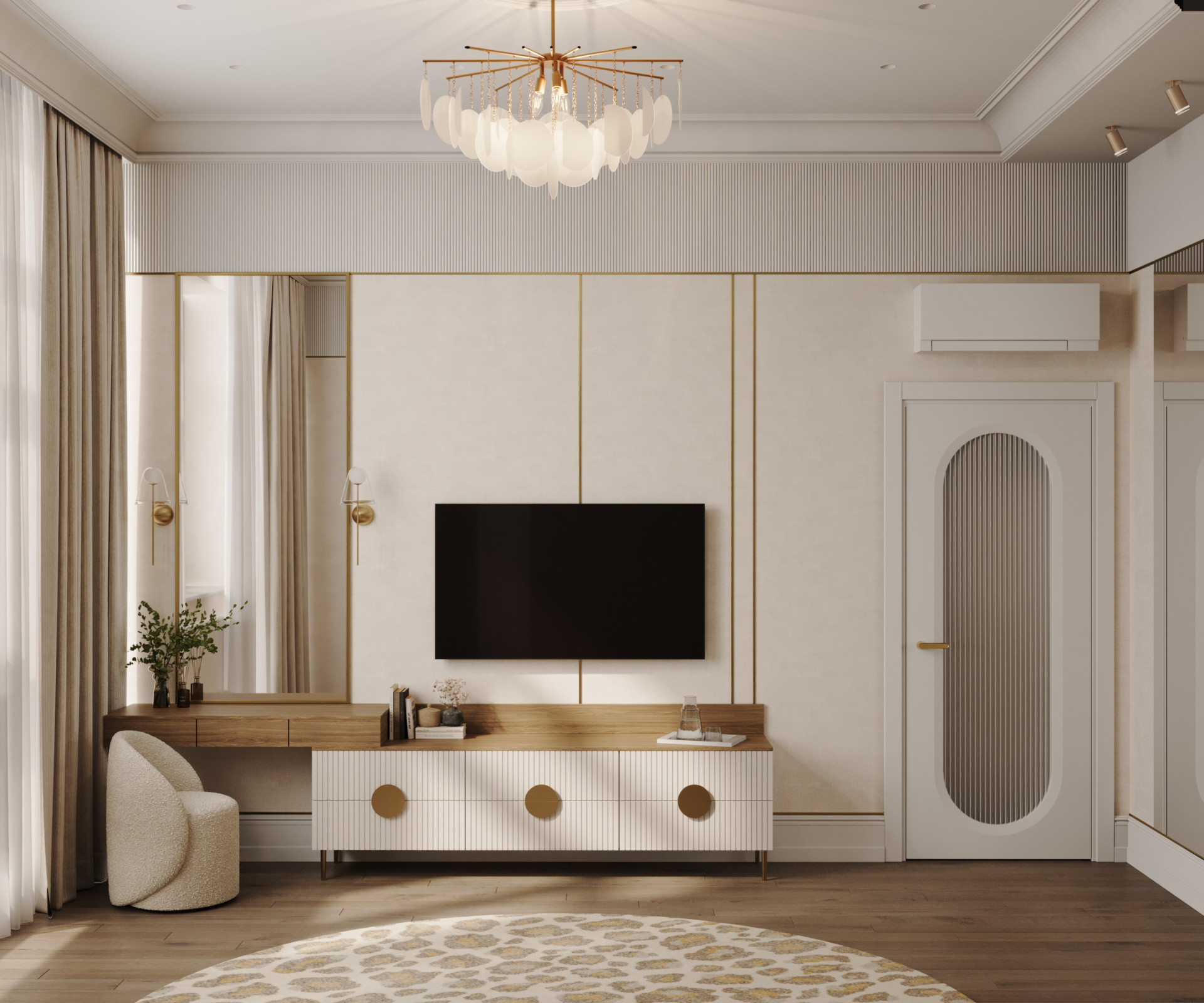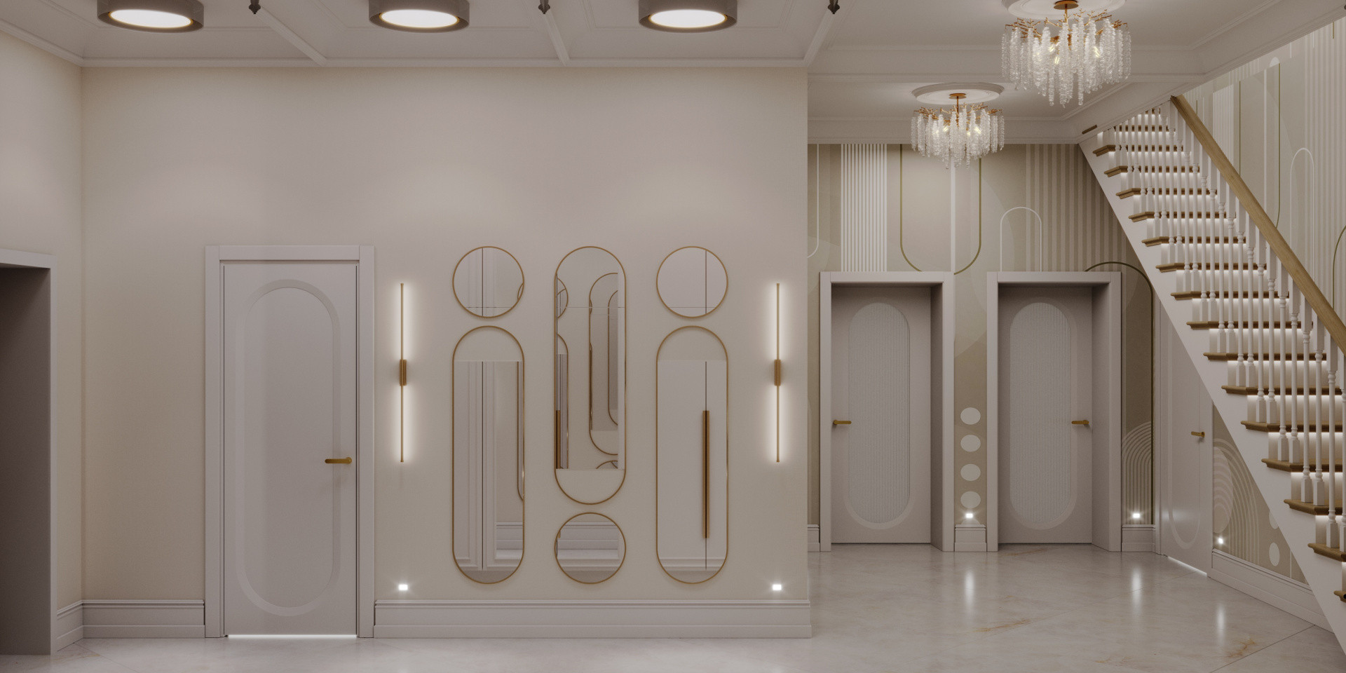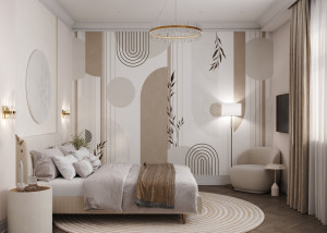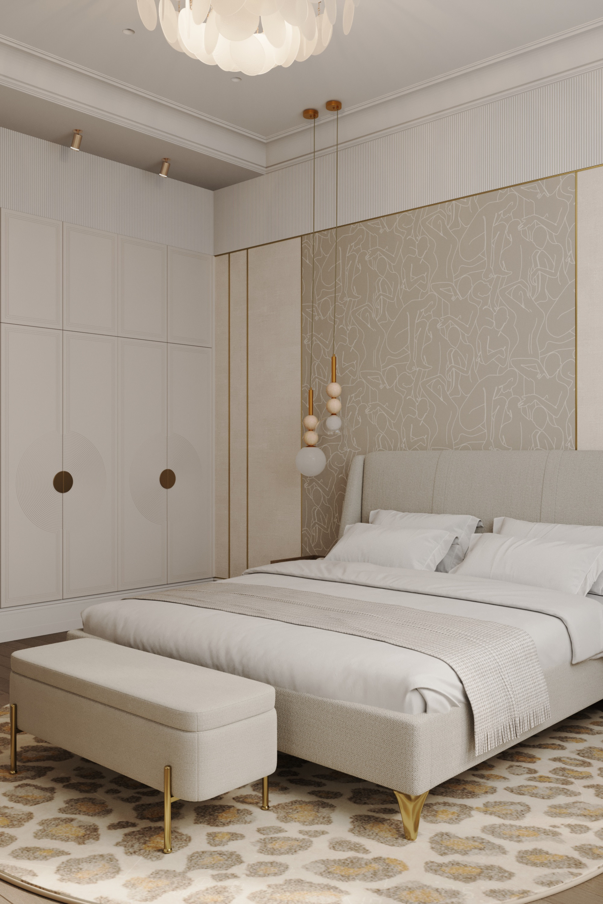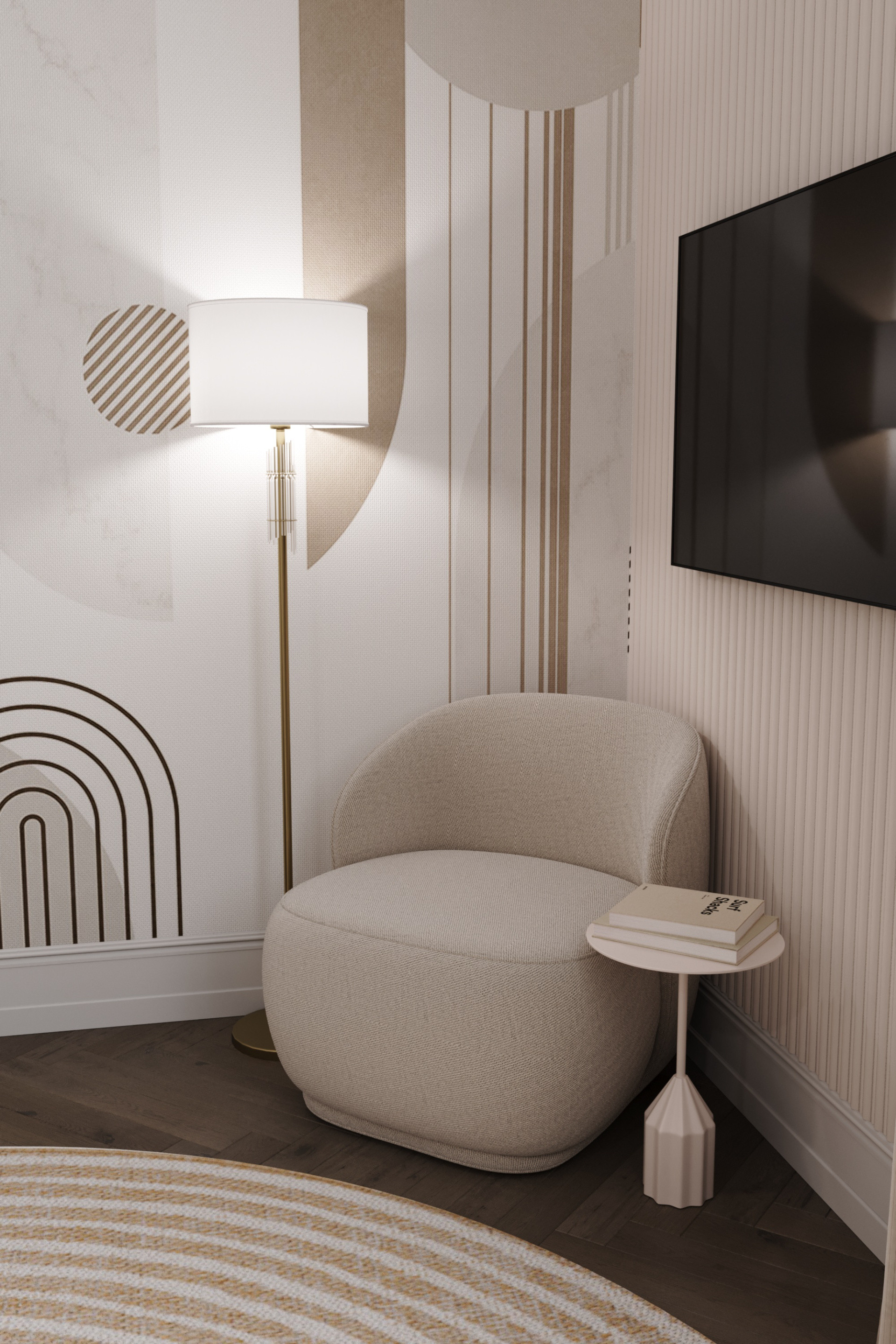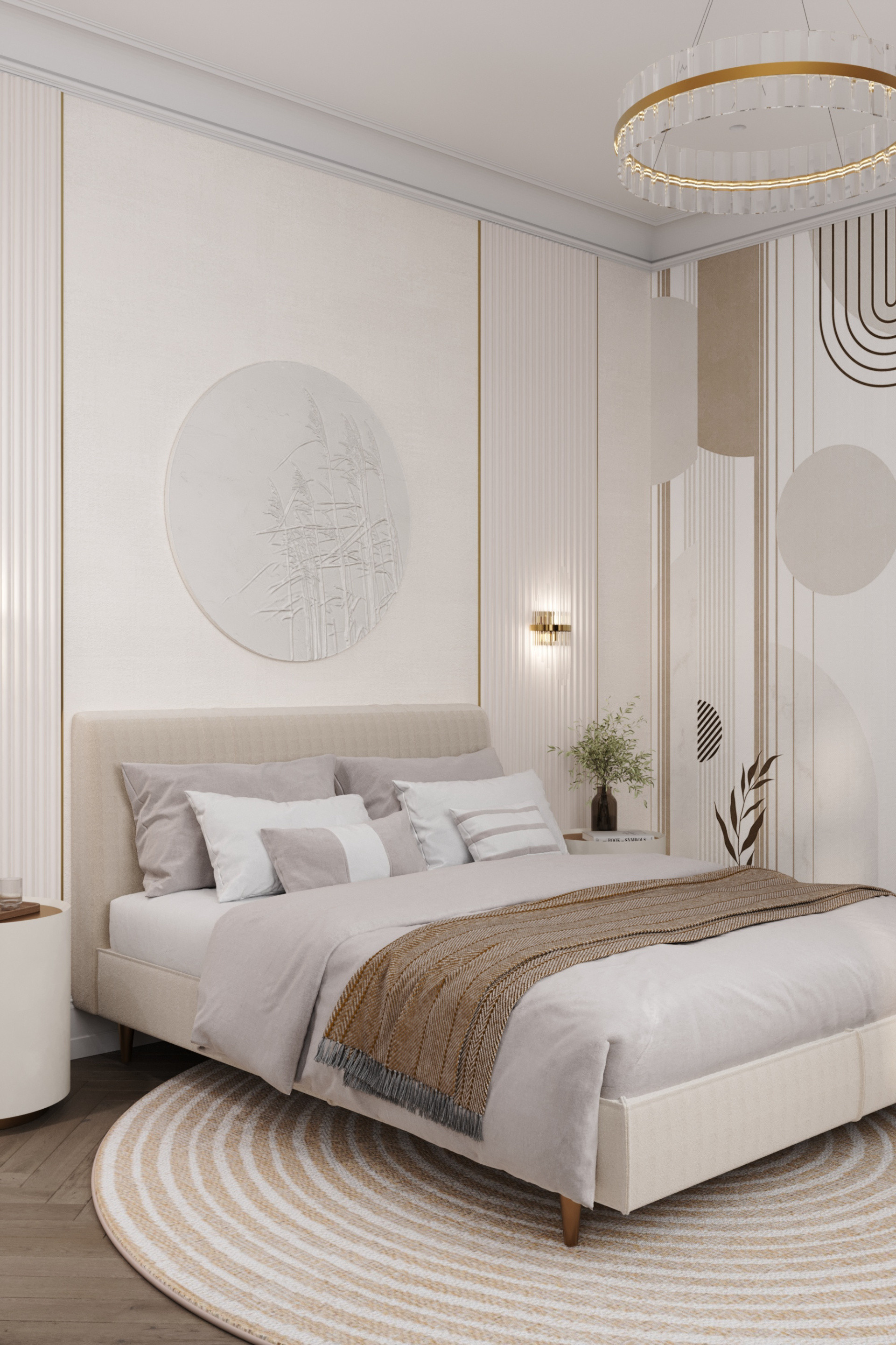 Этот проект мы разработали для нашего постоянного Заказчика. В пожеланиях было создать достаточно минималистичный интерьер для молодой девушки - дочери Заказчика. В ходе проектирования мы меняли общую цветовую гамму интерьера, стилистику и орнамент обоев, подбирая оптимально подходящий вариант, т.к. у хозяйки дома изначально не было четкого понимания в каких тонах хотелось бы видеть свой интерьер. Обычно такое понимание приходит во время совместного выезда на предварительный подбор материалов, который мы осуществляем еще до начала работы над Дизайн-проектом. Но в данном случае провести такой выезд у нас не было возможности и всё подбиралось уже в процессе проектирования. В ходе обсуждений была согласована светлая нейтральная цветовая гамма с добавлением кремово-кофейного оттенка в текстителе и обоях. Геометрический орнамент сделал интерьер более молодежным и современным, а молдинги, добавленные к его плавным линиям, придали интерьеру классики.