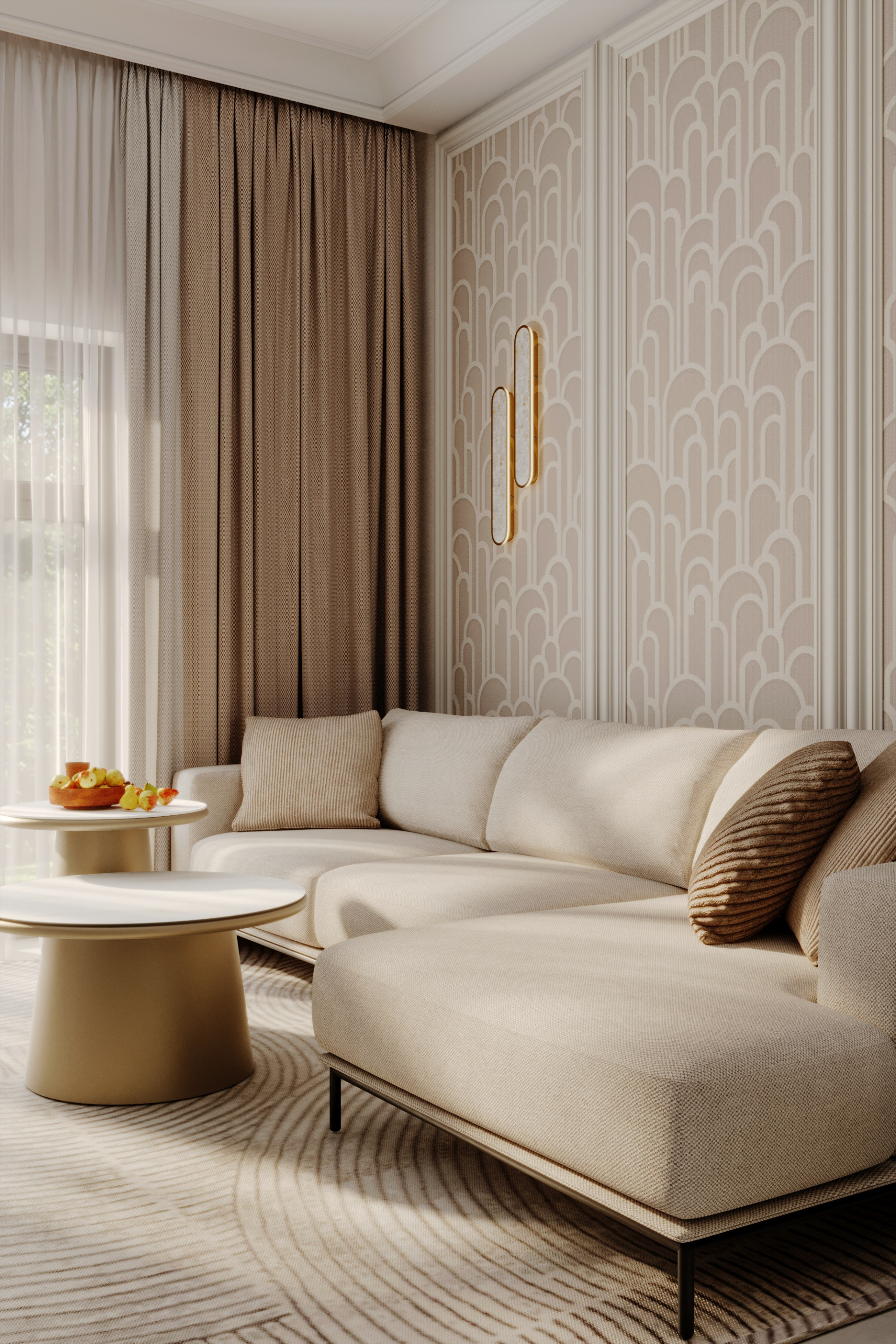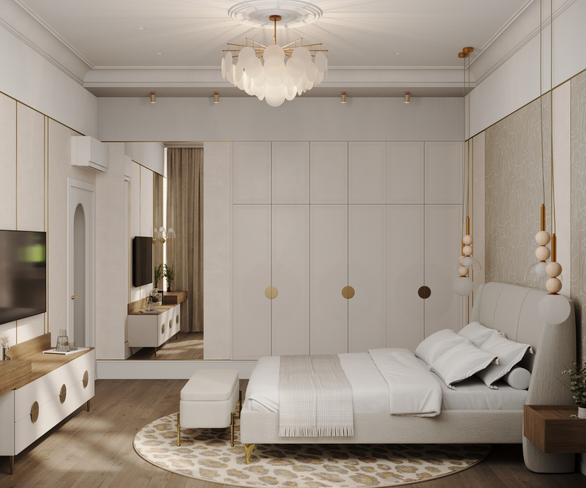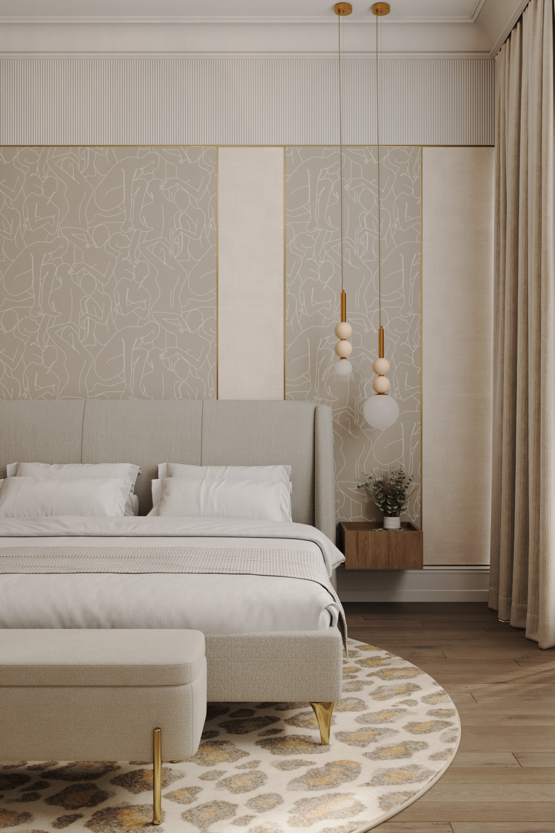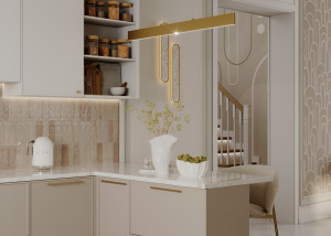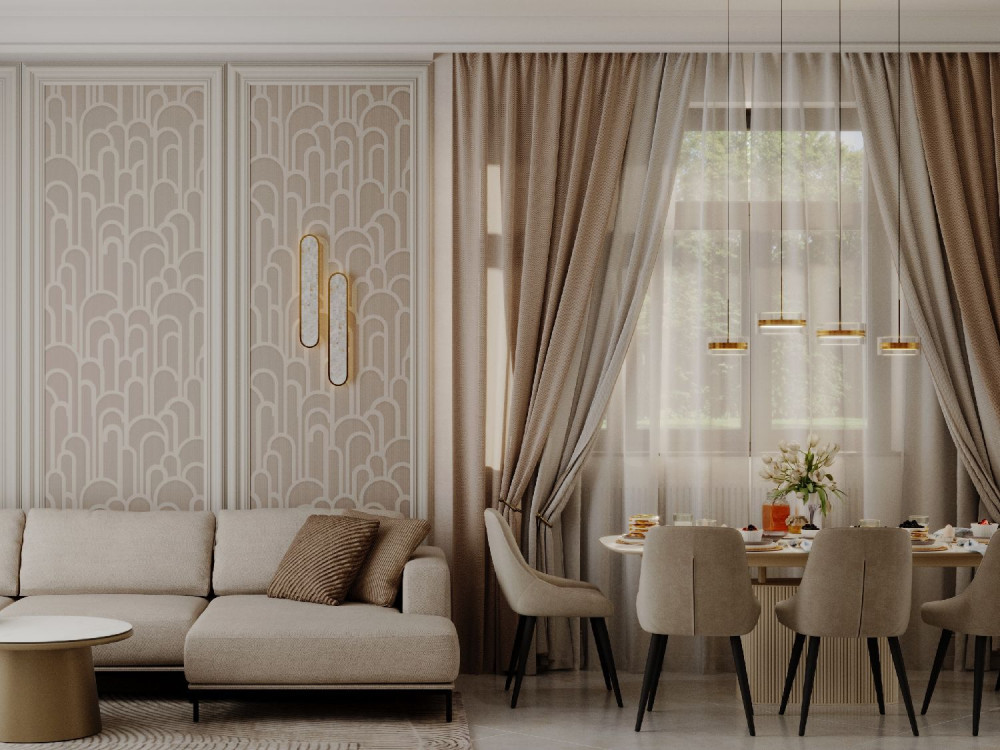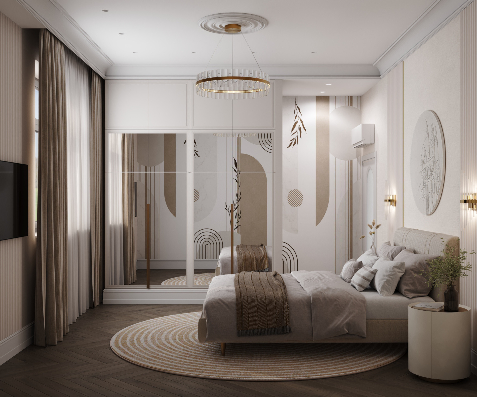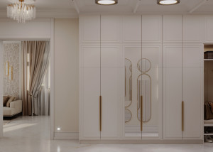 Этот проект мы разработали для нашего постоянного Заказчика. В пожеланиях было создать достаточно минималистичный интерьер для молодой девушки - дочери Заказчика. В ходе проектирования мы меняли общую цветовую гамму интерьера, стилистику и орнамент обоев, подбирая оптимально подходящий вариант, т.к. у хозяйки дома изначально не было четкого понимания в каких тонах хотелось бы видеть свой интерьер. Обычно такое понимание приходит во время совместного выезда на предварительный подбор материалов, который мы осуществляем еще до начала работы над Дизайн-проектом. Но в данном случае провести такой выезд у нас не было возможности и всё подбиралось уже в процессе проектирования. В ходе обсуждений была согласована светлая нейтральная цветовая гамма с добавлением кремово-кофейного оттенка в текстителе и обоях. Геометрический орнамент сделал интерьер более молодежным и современным, а молдинги, добавленные к его плавным линиям, придали интерьеру классики.