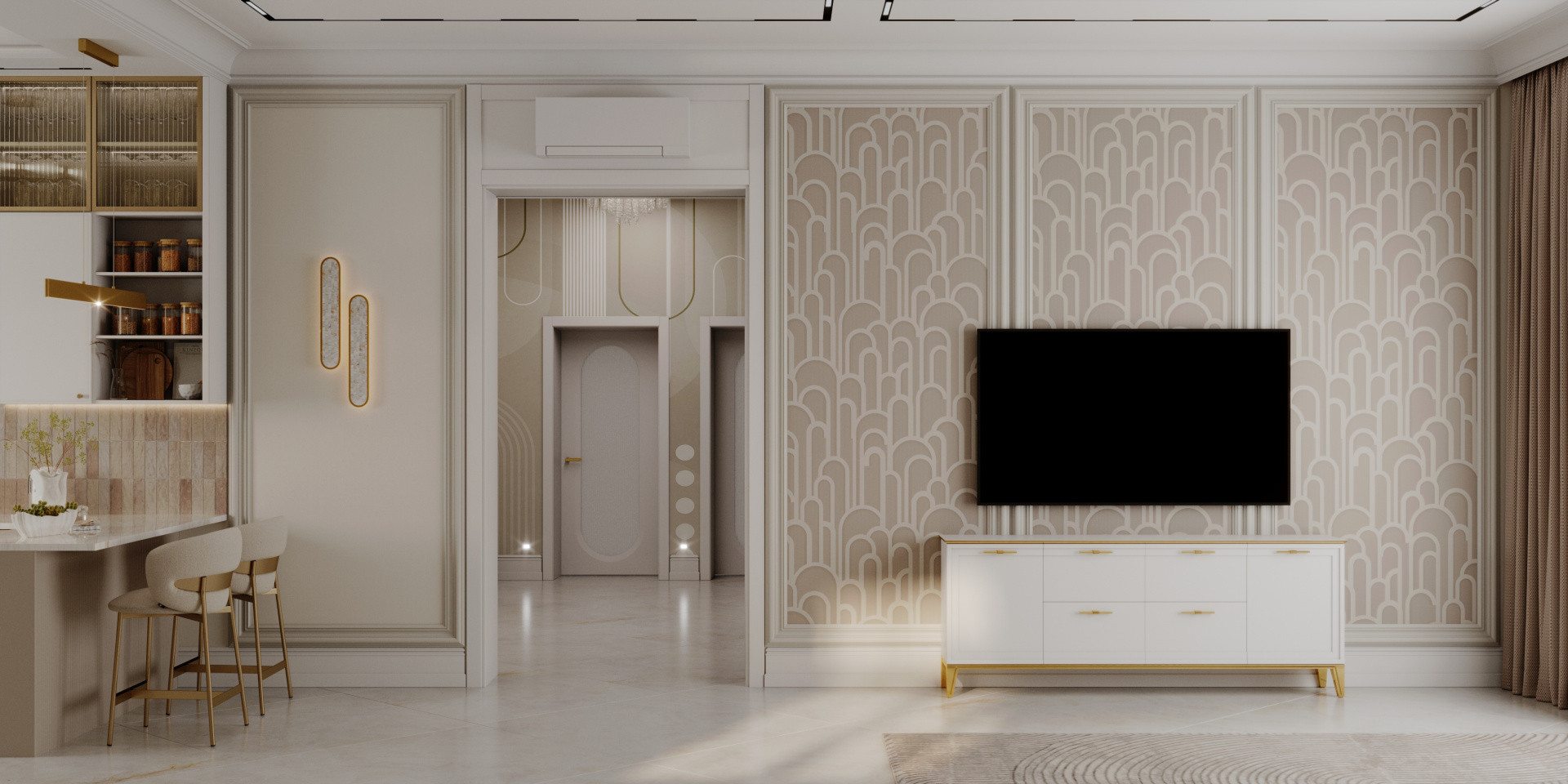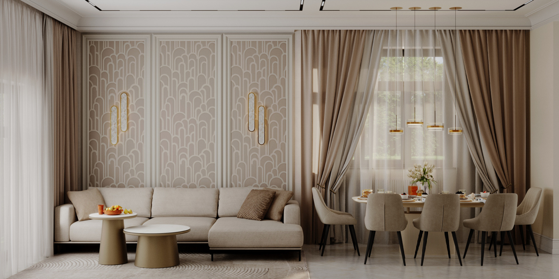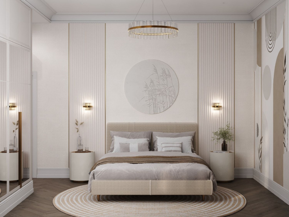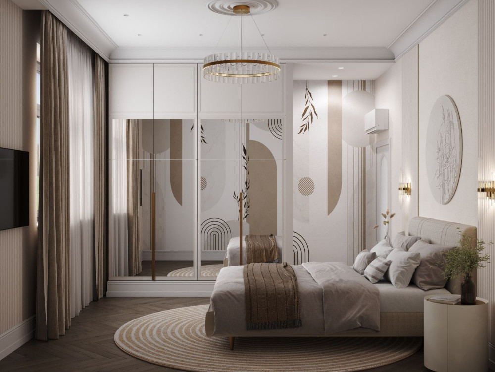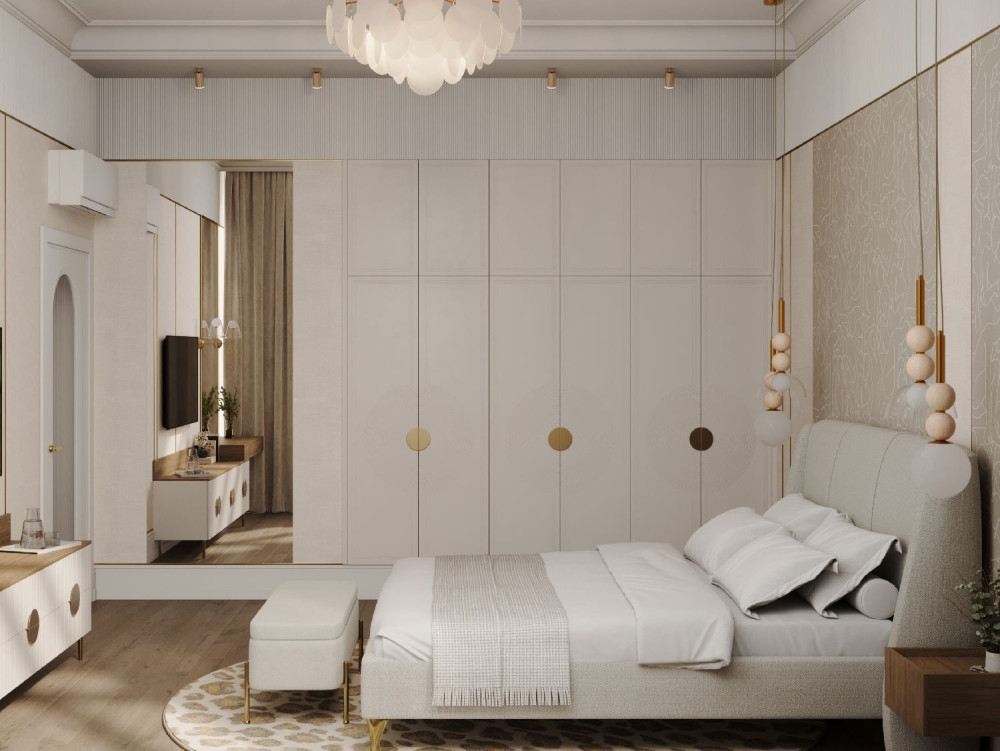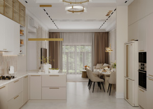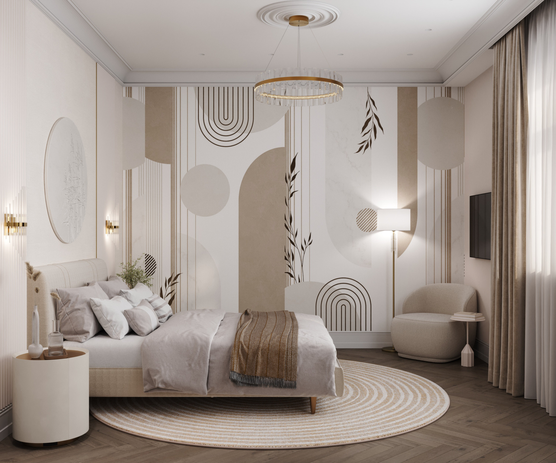 Этот проект мы разработали для нашего постоянного Заказчика. В пожеланиях было создать достаточно минималистичный интерьер для молодой девушки - дочери Заказчика. В ходе проектирования мы меняли общую цветовую гамму интерьера, стилистику и орнамент обоев, подбирая оптимально подходящий вариант, т.к. у хозяйки дома изначально не было четкого понимания в каких тонах хотелось бы видеть свой интерьер. Обычно такое понимание приходит во время совместного выезда на предварительный подбор материалов, который мы осуществляем еще до начала работы над Дизайн-проектом. Но в данном случае провести такой выезд у нас не было возможности и всё подбиралось уже в процессе проектирования. В ходе обсуждений была согласована светлая нейтральная цветовая гамма с добавлением кремово-кофейного оттенка в текстителе и обоях. Геометрический орнамент сделал интерьер более молодежным и современным, а молдинги, добавленные к его плавным линиям, придали интерьеру классики.