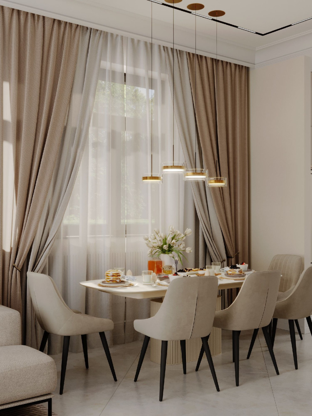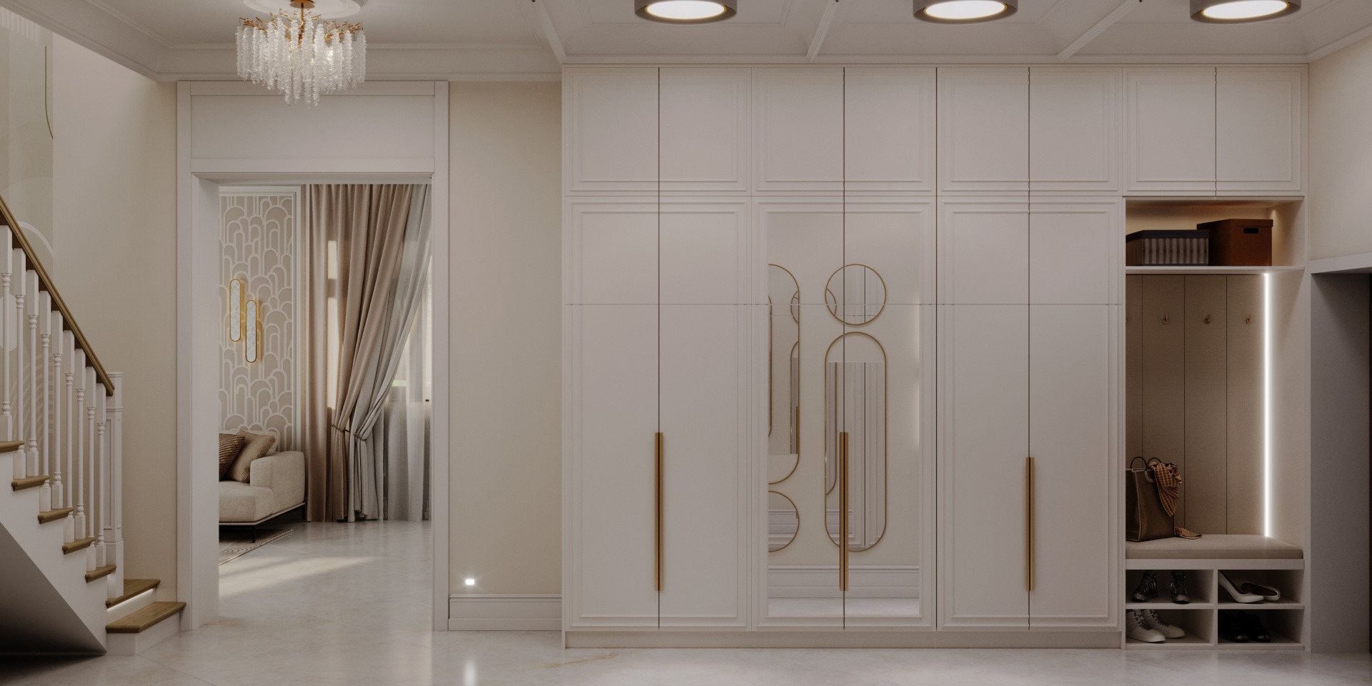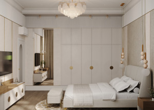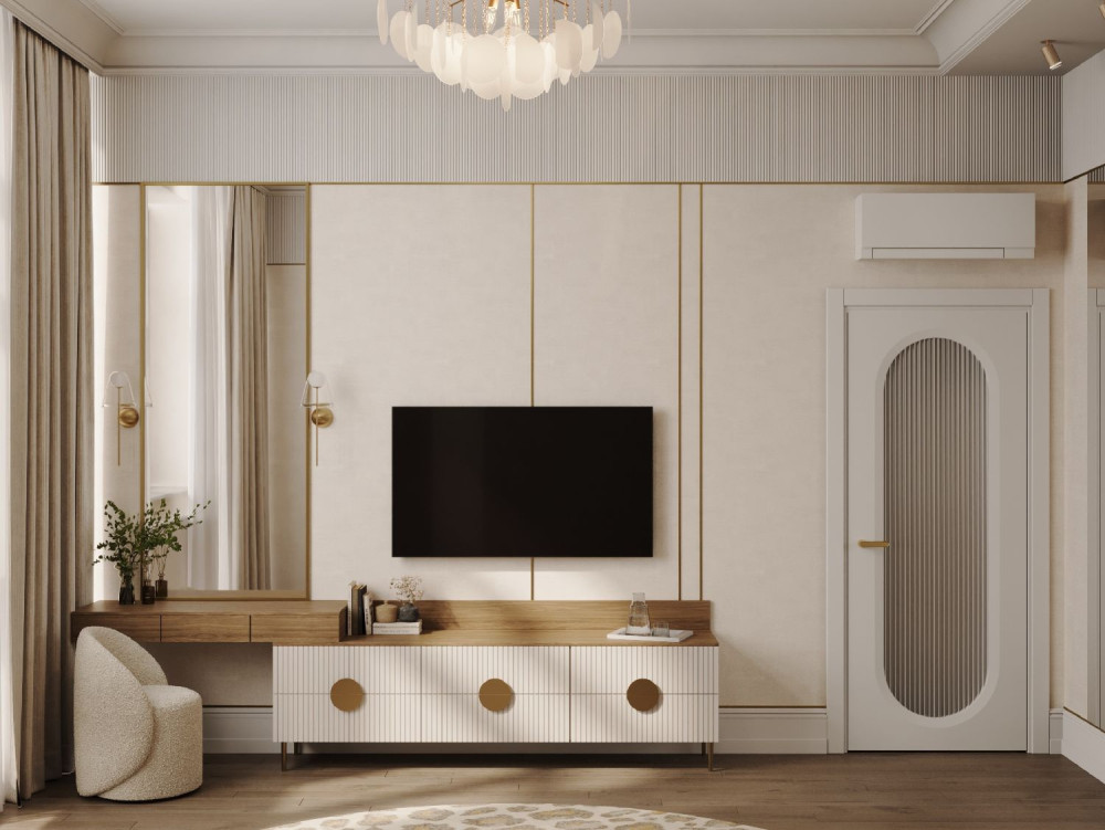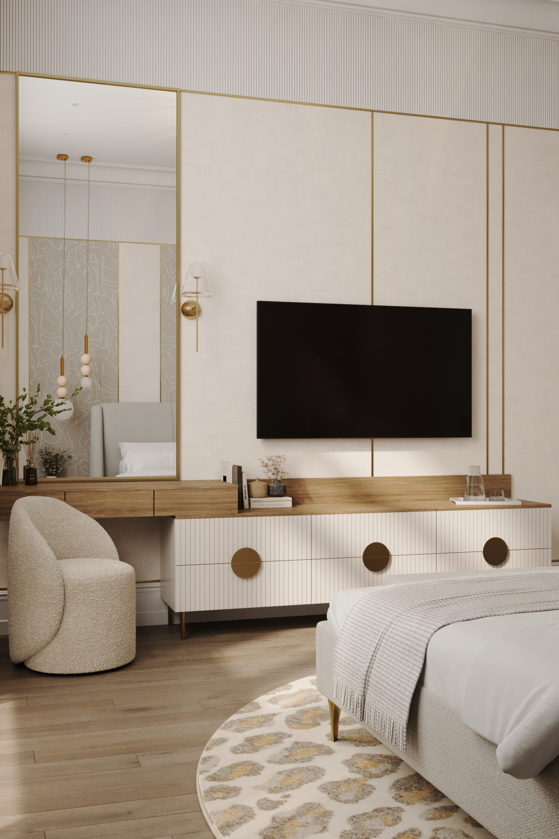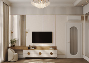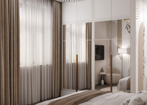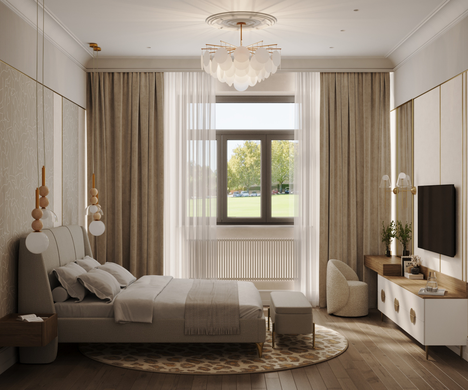 Этот проект мы разработали для нашего постоянного Заказчика. В пожеланиях было создать достаточно минималистичный интерьер для молодой девушки - дочери Заказчика. В ходе проектирования мы меняли общую цветовую гамму интерьера, стилистику и орнамент обоев, подбирая оптимально подходящий вариант, т.к. у хозяйки дома изначально не было четкого понимания в каких тонах хотелось бы видеть свой интерьер. Обычно такое понимание приходит во время совместного выезда на предварительный подбор материалов, который мы осуществляем еще до начала работы над Дизайн-проектом. Но в данном случае провести такой выезд у нас не было возможности и всё подбиралось уже в процессе проектирования. В ходе обсуждений была согласована светлая нейтральная цветовая гамма с добавлением кремово-кофейного оттенка в текстителе и обоях. Геометрический орнамент сделал интерьер более молодежным и современным, а молдинги, добавленные к его плавным линиям, придали интерьеру классики.