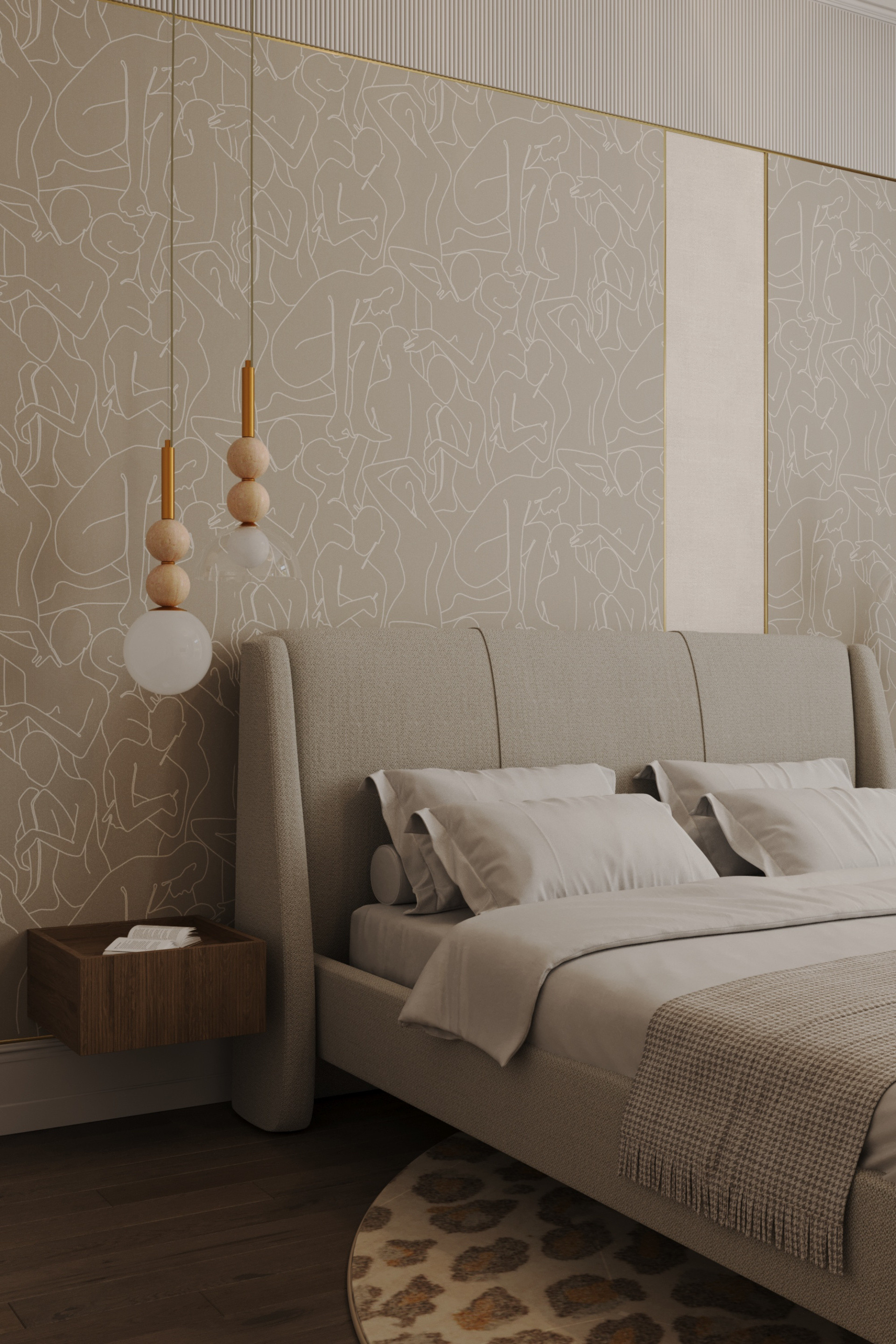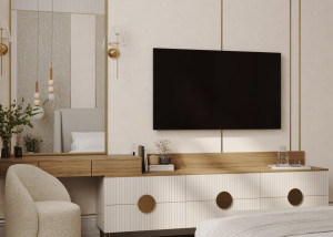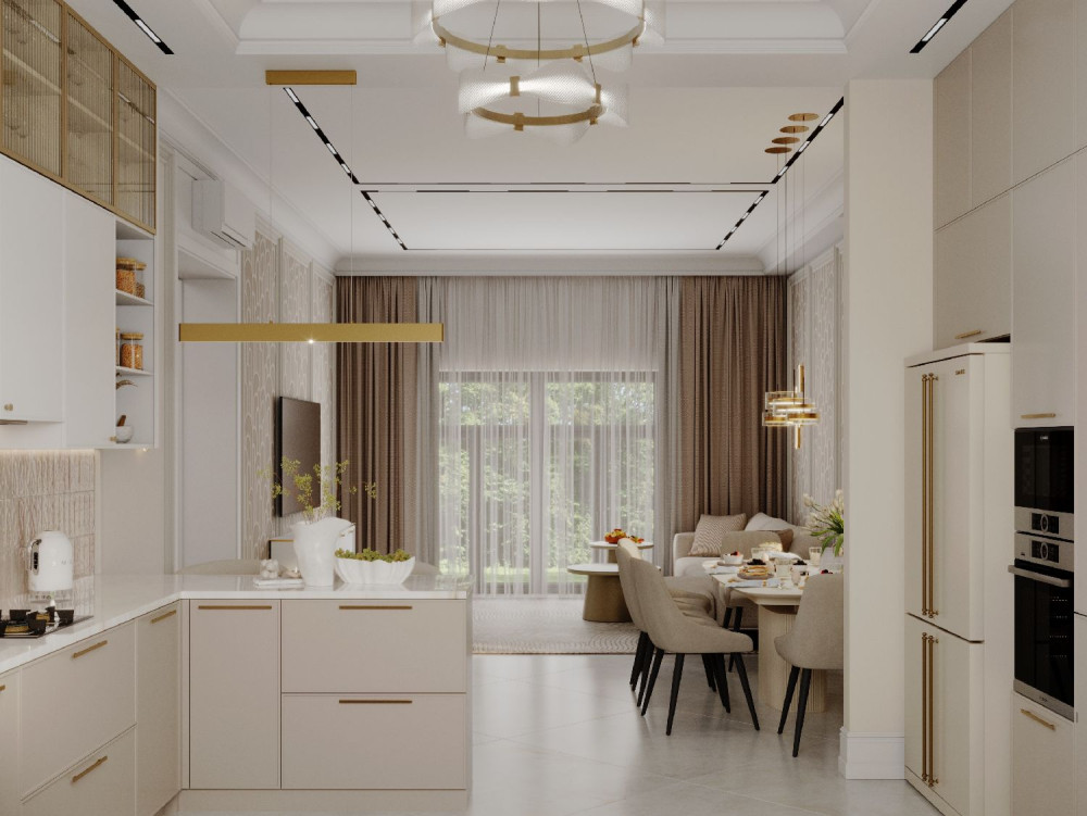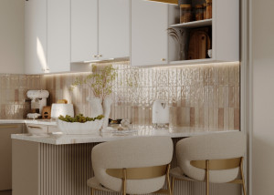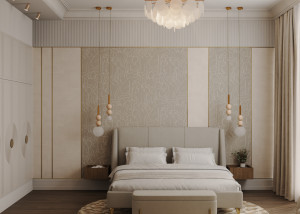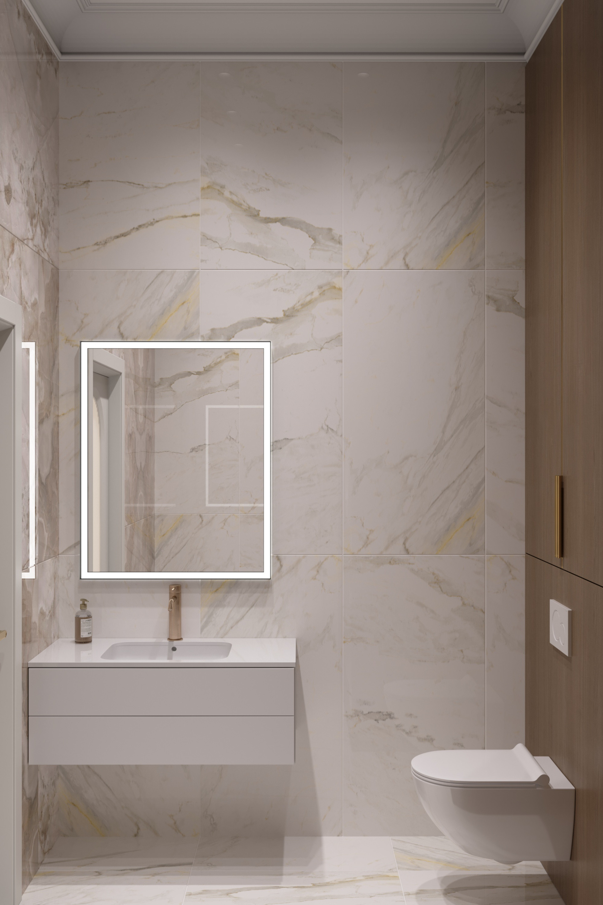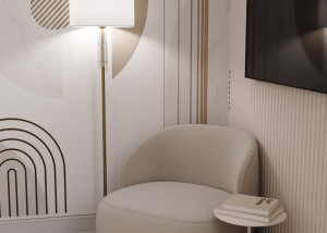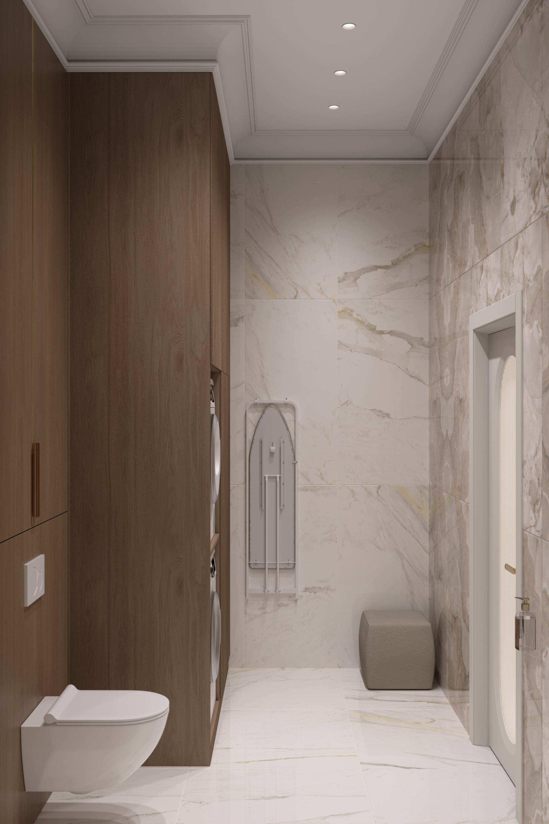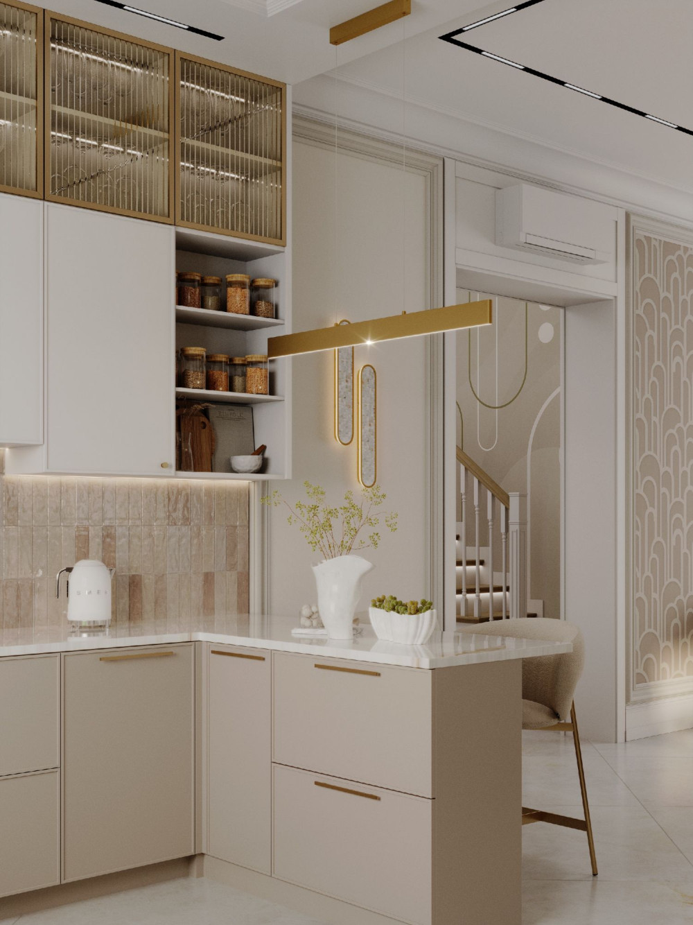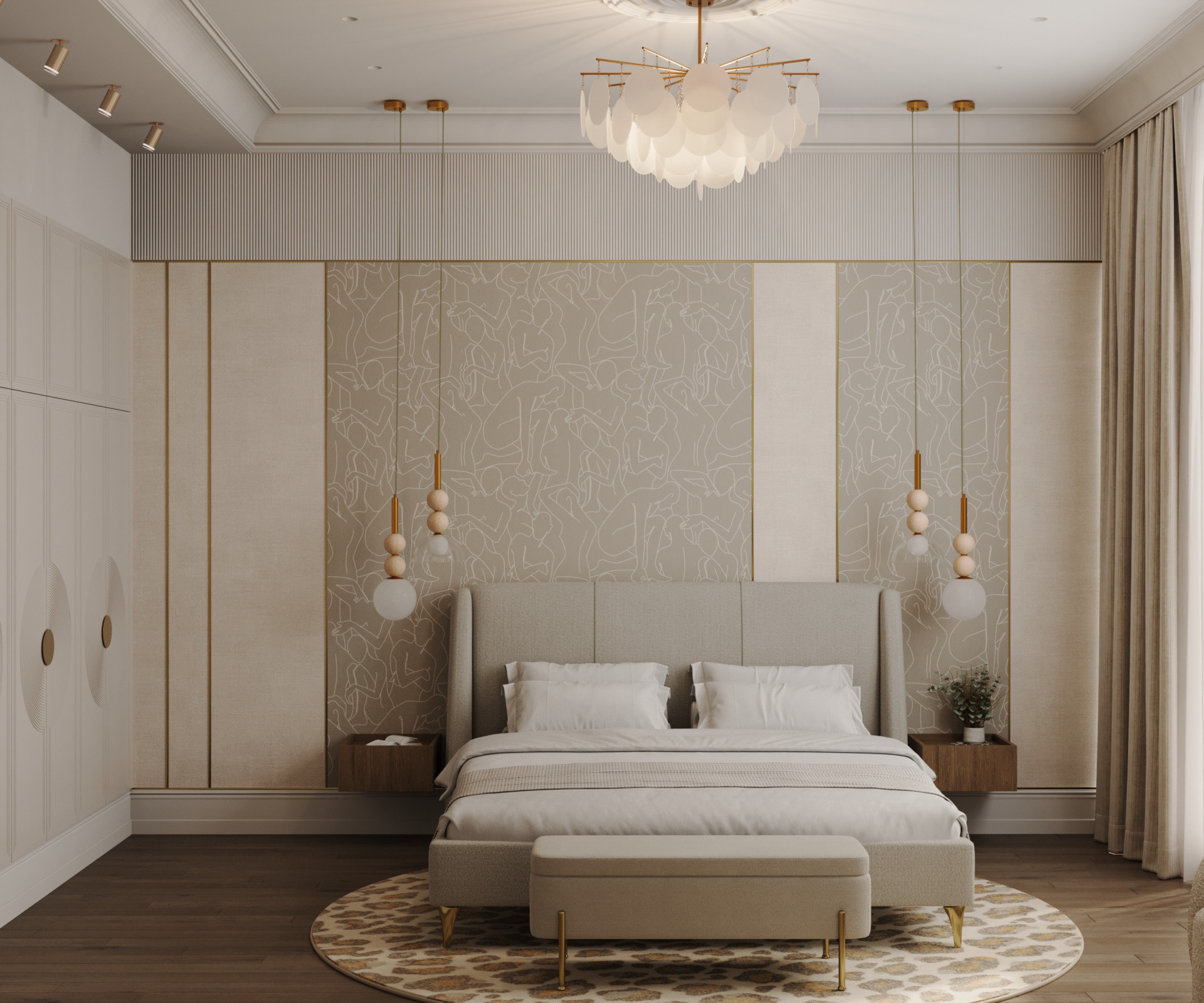Этот проект мы разработали для нашего постоянного Заказчика. В пожеланиях было создать достаточно минималистичный интерьер для молодой девушки - дочери Заказчика. В ходе проектирования мы меняли общую цветовую гамму интерьера, стилистику и орнамент обоев, подбирая оптимально подходящий вариант, т.к. у хозяйки дома изначально не было четкого понимания в каких тонах хотелось бы видеть свой интерьер. Обычно такое понимание приходит во время совместного выезда на предварительный подбор материалов, который мы осуществляем еще до начала работы над Дизайн-проектом. Но в данном случае провести такой выезд у нас не было возможности и всё подбиралось уже в процессе проектирования. В ходе обсуждений была согласована светлая нейтральная цветовая гамма с добавлением кремово-кофейного оттенка в текстителе и обоях. Геометрический орнамент сделал интерьер более молодежным и современным, а молдинги, добавленные к его плавным линиям, придали интерьеру классики.