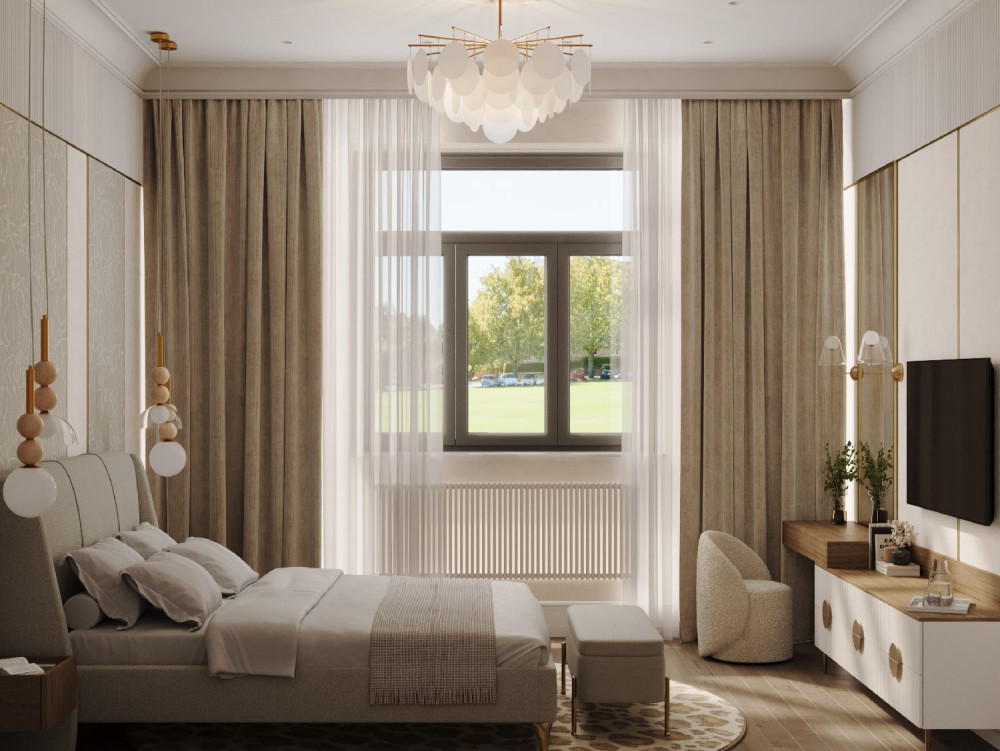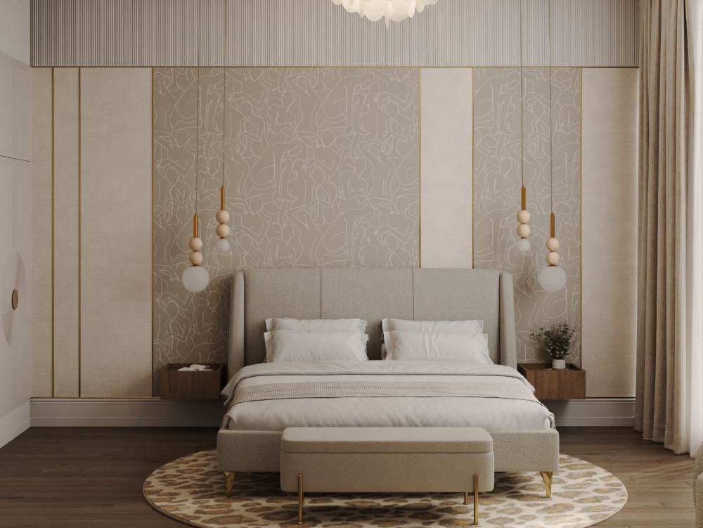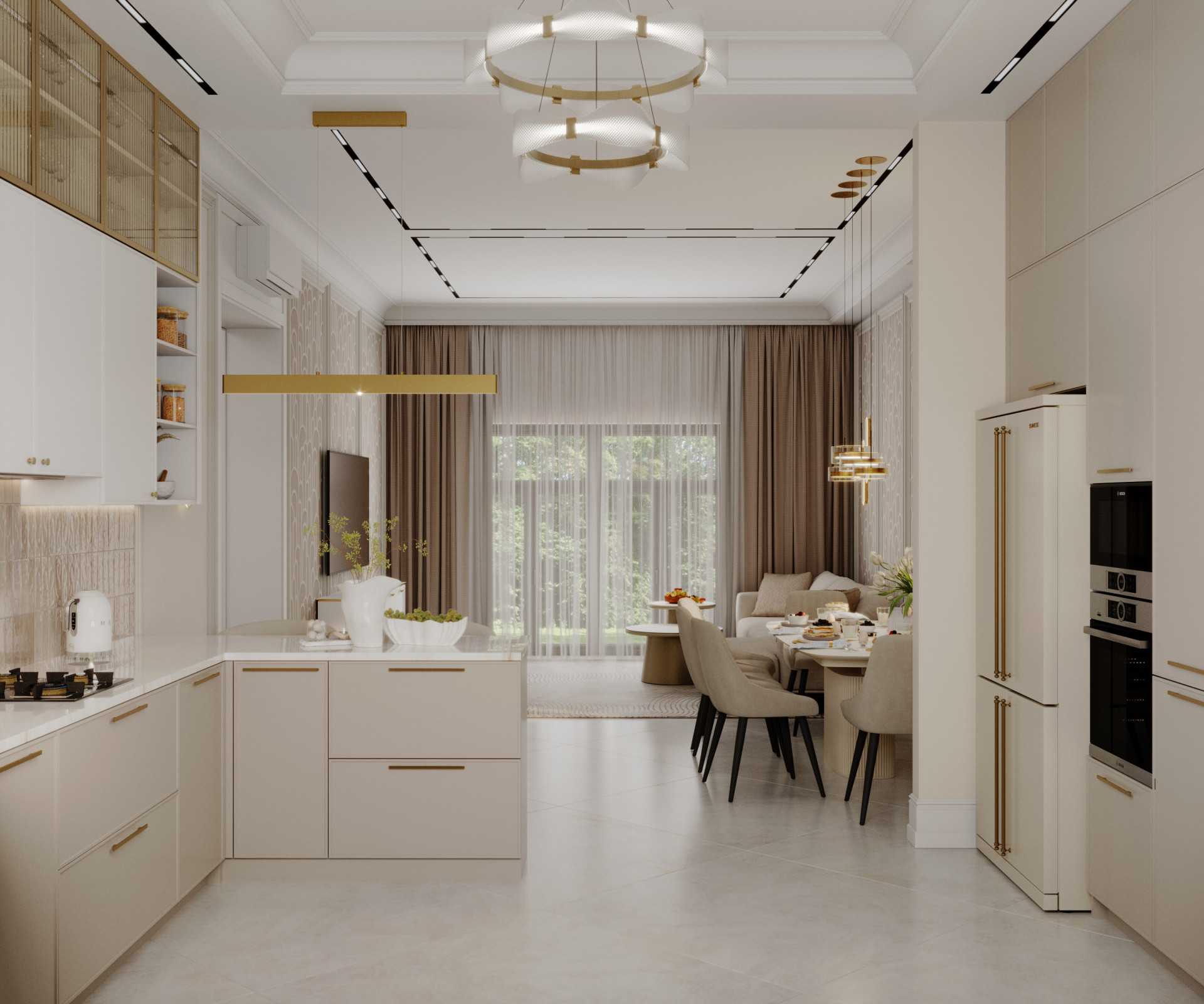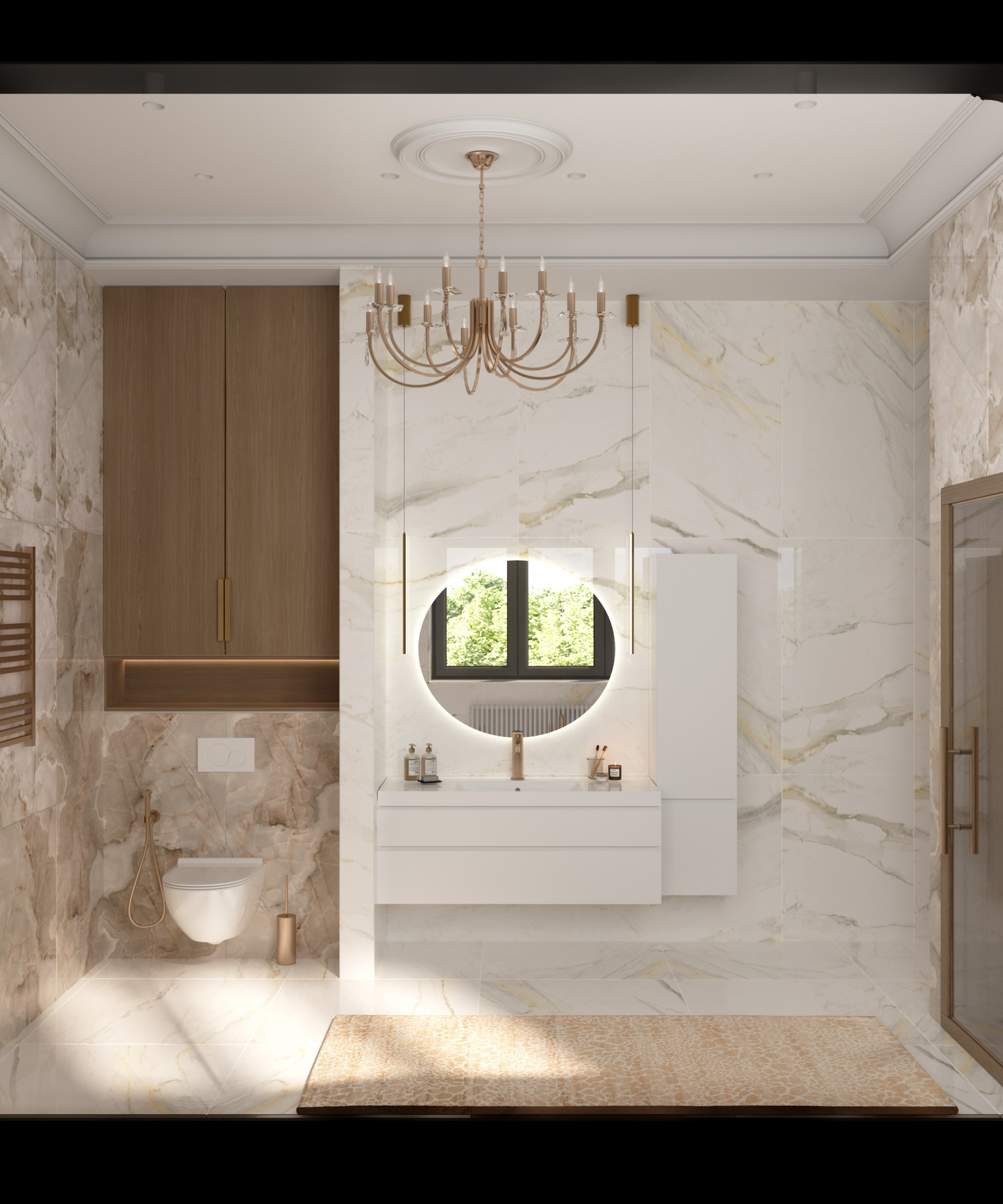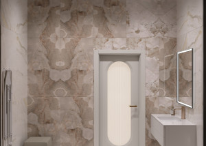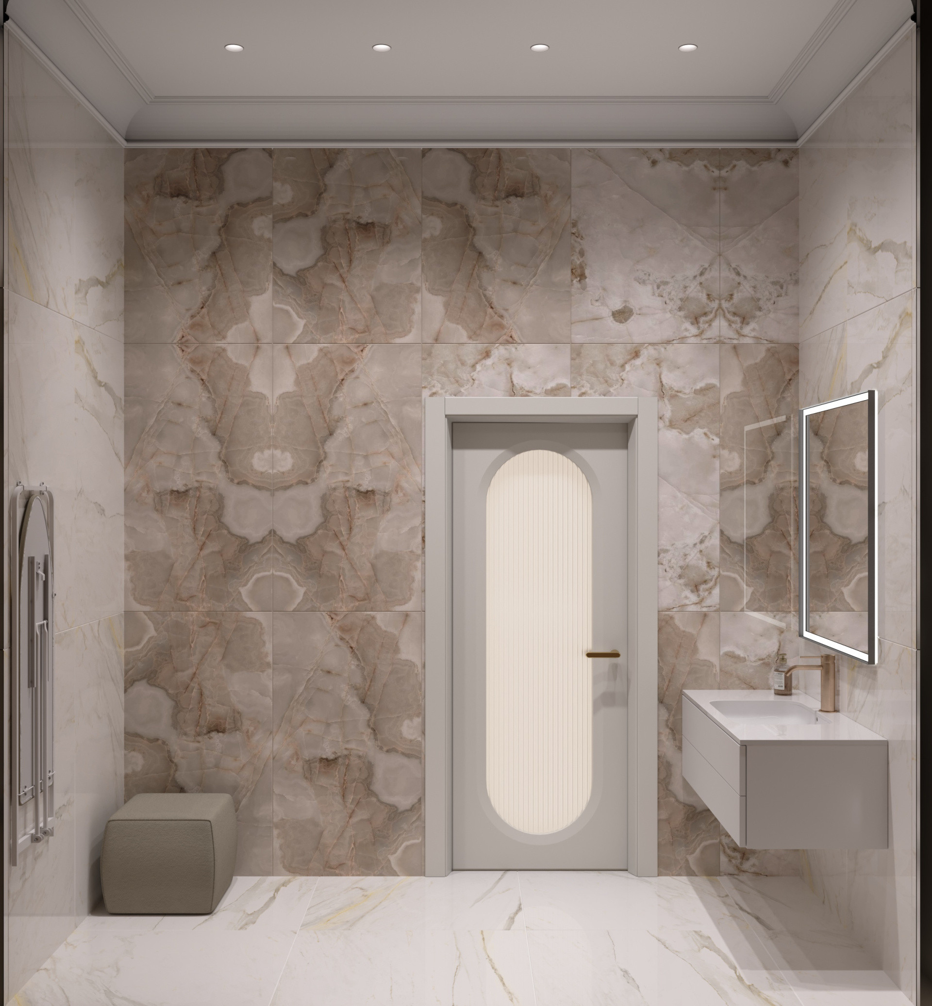 Этот проект мы разработали для нашего постоянного Заказчика. В пожеланиях было создать достаточно минималистичный интерьер для молодой девушки - дочери Заказчика. В ходе проектирования мы меняли общую цветовую гамму интерьера, стилистику и орнамент обоев, подбирая оптимально подходящий вариант, т.к. у хозяйки дома изначально не было четкого понимания в каких тонах хотелось бы видеть свой интерьер. Обычно такое понимание приходит во время совместного выезда на предварительный подбор материалов, который мы осуществляем еще до начала работы над Дизайн-проектом. Но в данном случае провести такой выезд у нас не было возможности и всё подбиралось уже в процессе проектирования. В ходе обсуждений была согласована светлая нейтральная цветовая гамма с добавлением кремово-кофейного оттенка в текстителе и обоях. Геометрический орнамент сделал интерьер более молодежным и современным, а молдинги, добавленные к его плавным линиям, придали интерьеру классики.